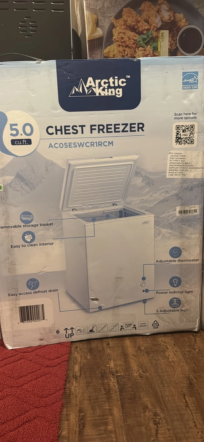 New Arctic King chest freezer. 5.0 cubic feet. Adjustable thermostat, power indicator light, and adjustable height. Features easy access defrost drain and moveable storage basket. Easy-to-clean interior.