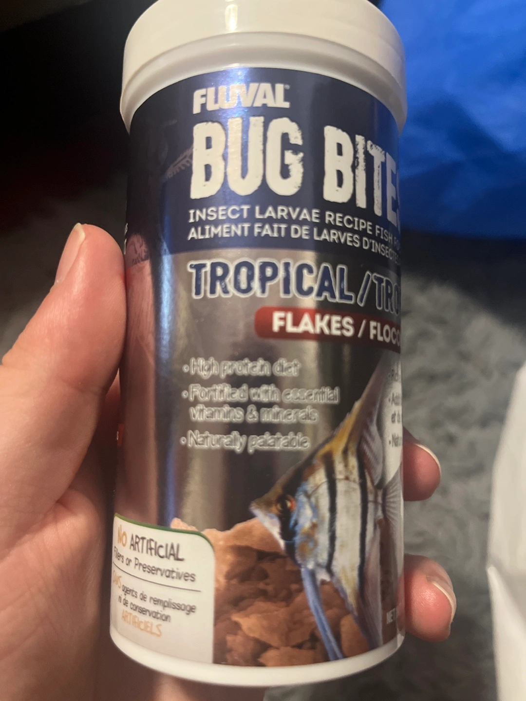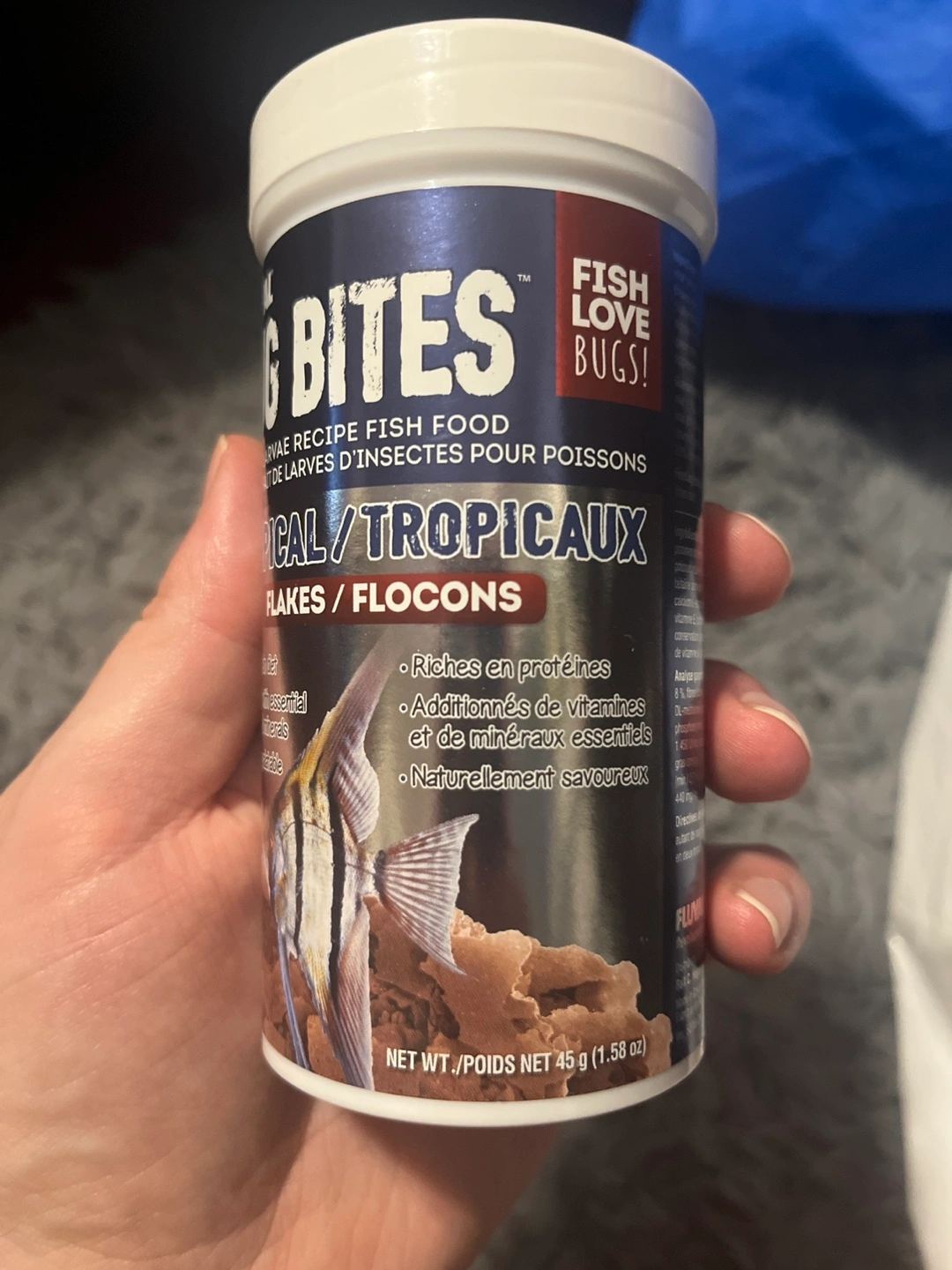 45g container of Fluval Bug Bites Tropical fish food flakes. Insect larvae recipe. High protein, fortified with vitamins and minerals. Naturally palatable. Some flakes missing only