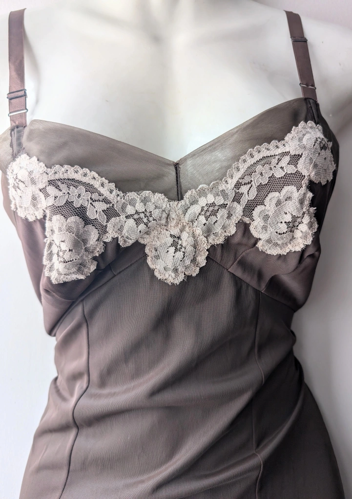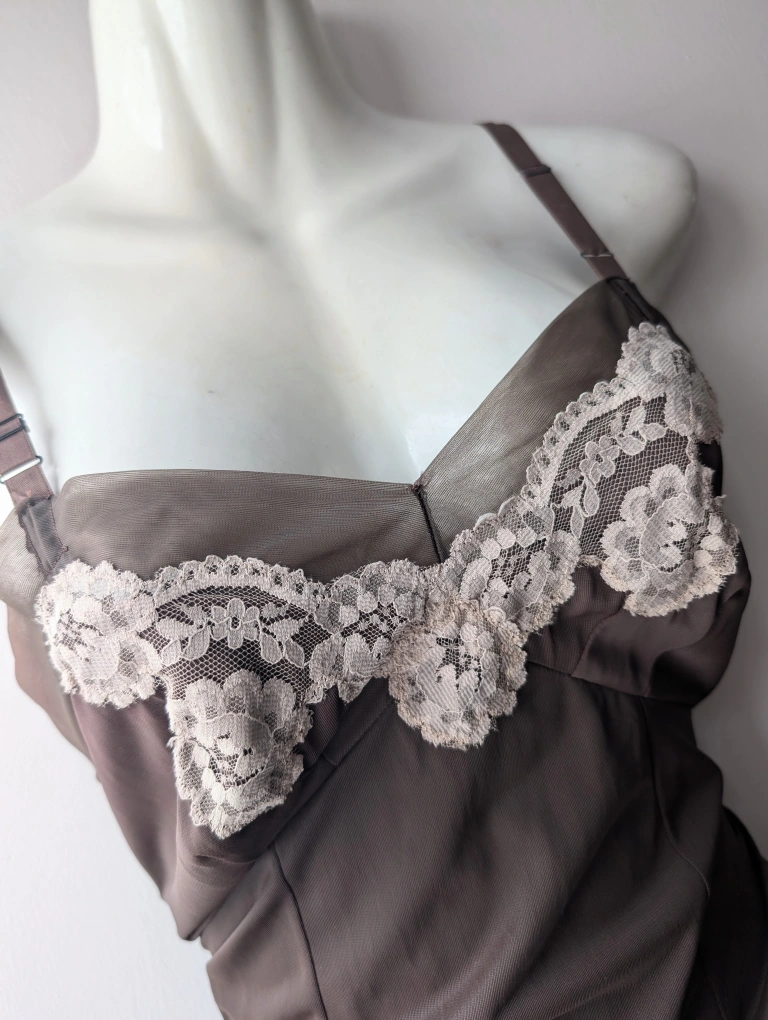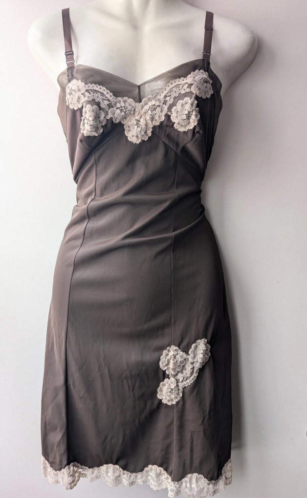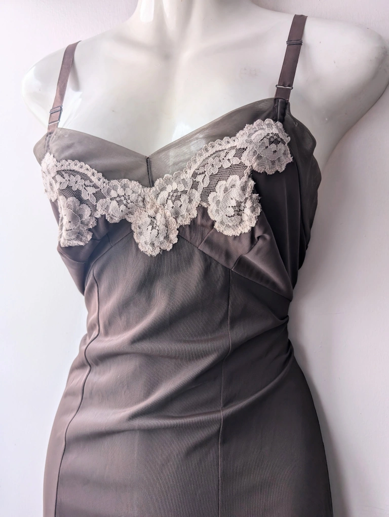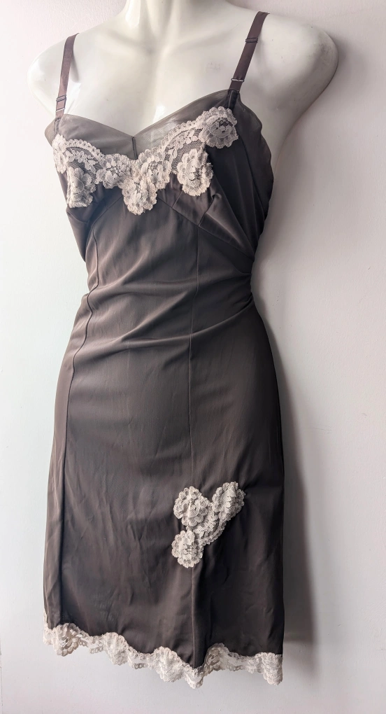 180Pretty slip/nightie from the 50's - 60's era size Small Almost opaque chocolate brown colour with beautiful, delicate lace detail. Sheer nylon lace trim on bustline Measurements, taken with garment lying flat, approximate: Length: 39" Bust: 32 Waist: 25-26" Hips: 34-36" Label: "Patricia" Item pinched at back for photos Good condition with small dark cluster of snags underneath one arm. Hard to see. Please see close up pics for details and/or ask if you would like more photos/videos