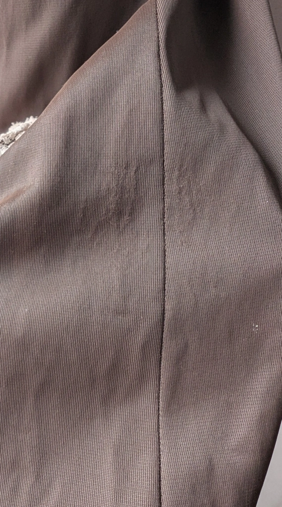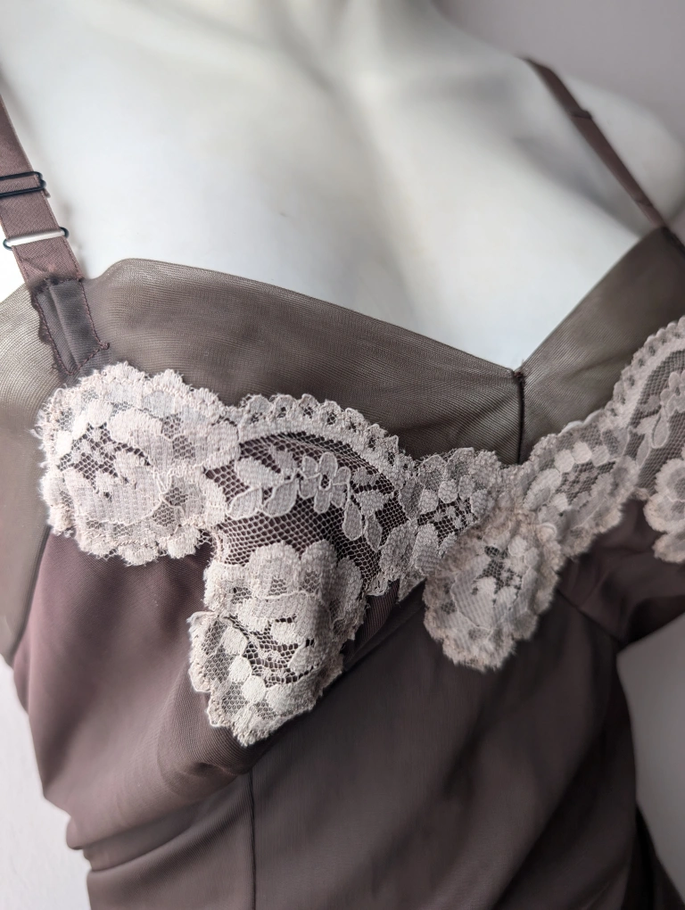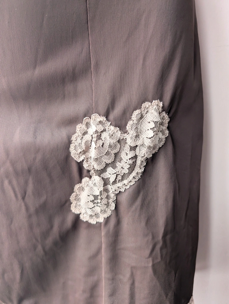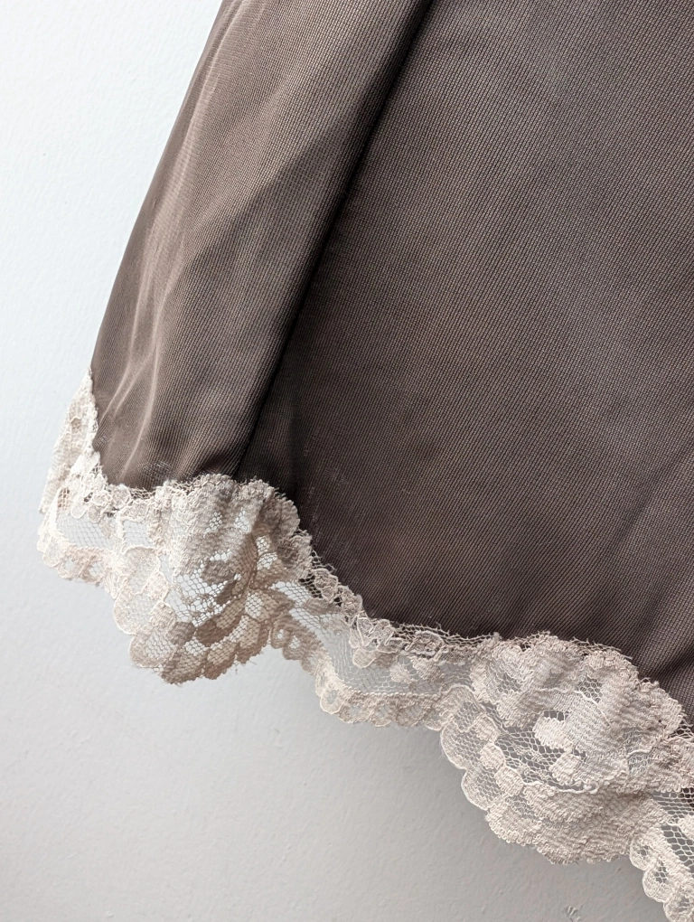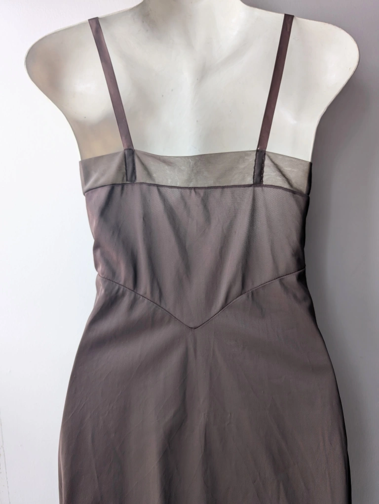 180Pretty slip/nightie from the 50's - 60's era size Small Almost opaque chocolate brown colour with beautiful, delicate lace detail. Sheer nylon lace trim on bustline Measurements, taken with garment lying flat, approximate: Length: 39" Bust: 32 Waist: 25-26" Hips: 34-36" Label: "Patricia" Item pinched at back for photos Good condition with small dark cluster of snags underneath one arm. Hard to see. Please see close up pics for details and/or ask if you would like more photos/videos