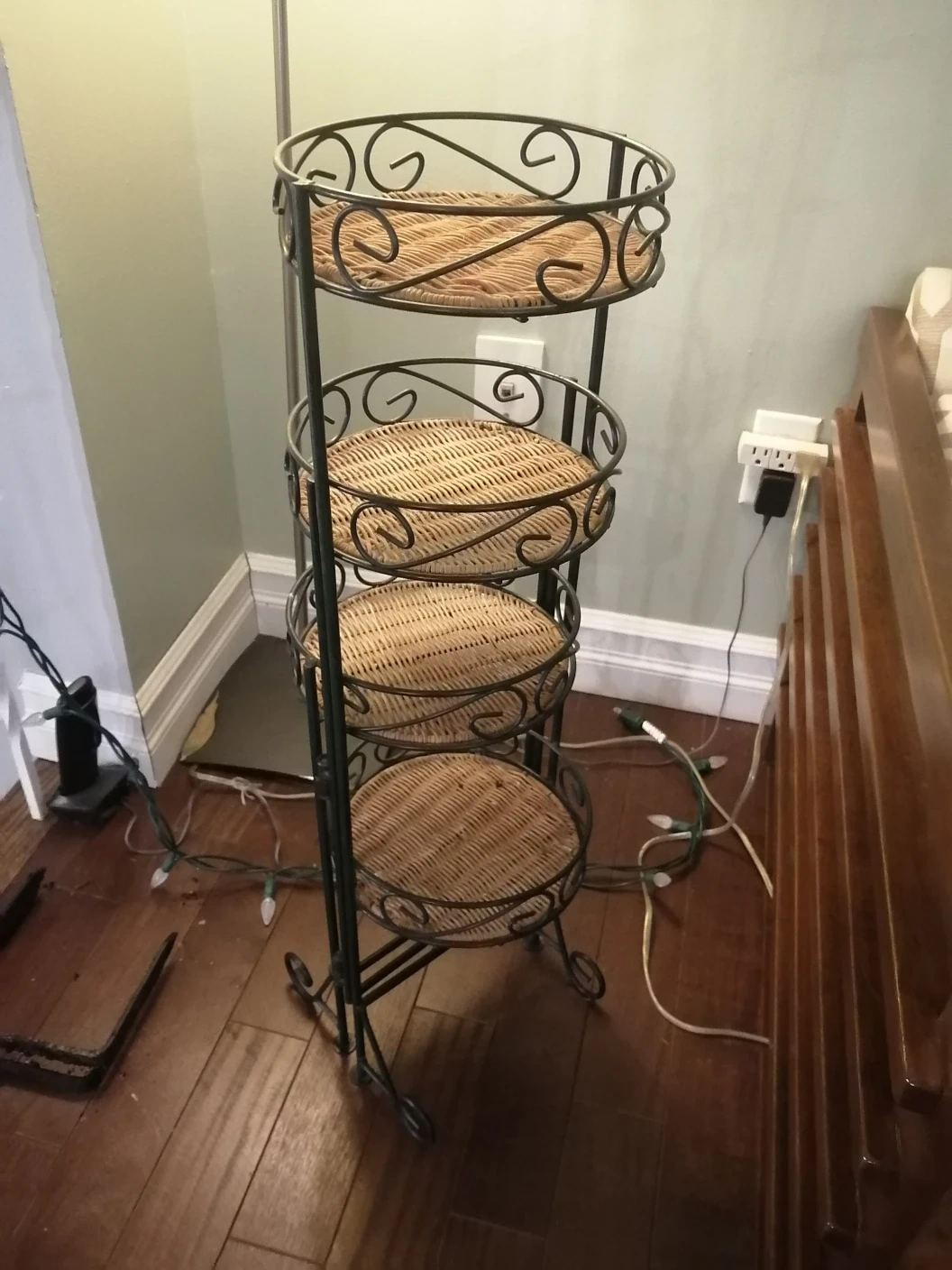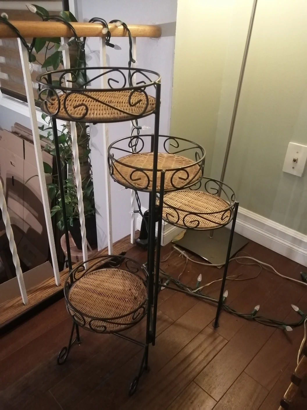 Four-tier plant stand. Metal frame. Wicker baskets. Good condition. Perfect for plants or other decorative items.