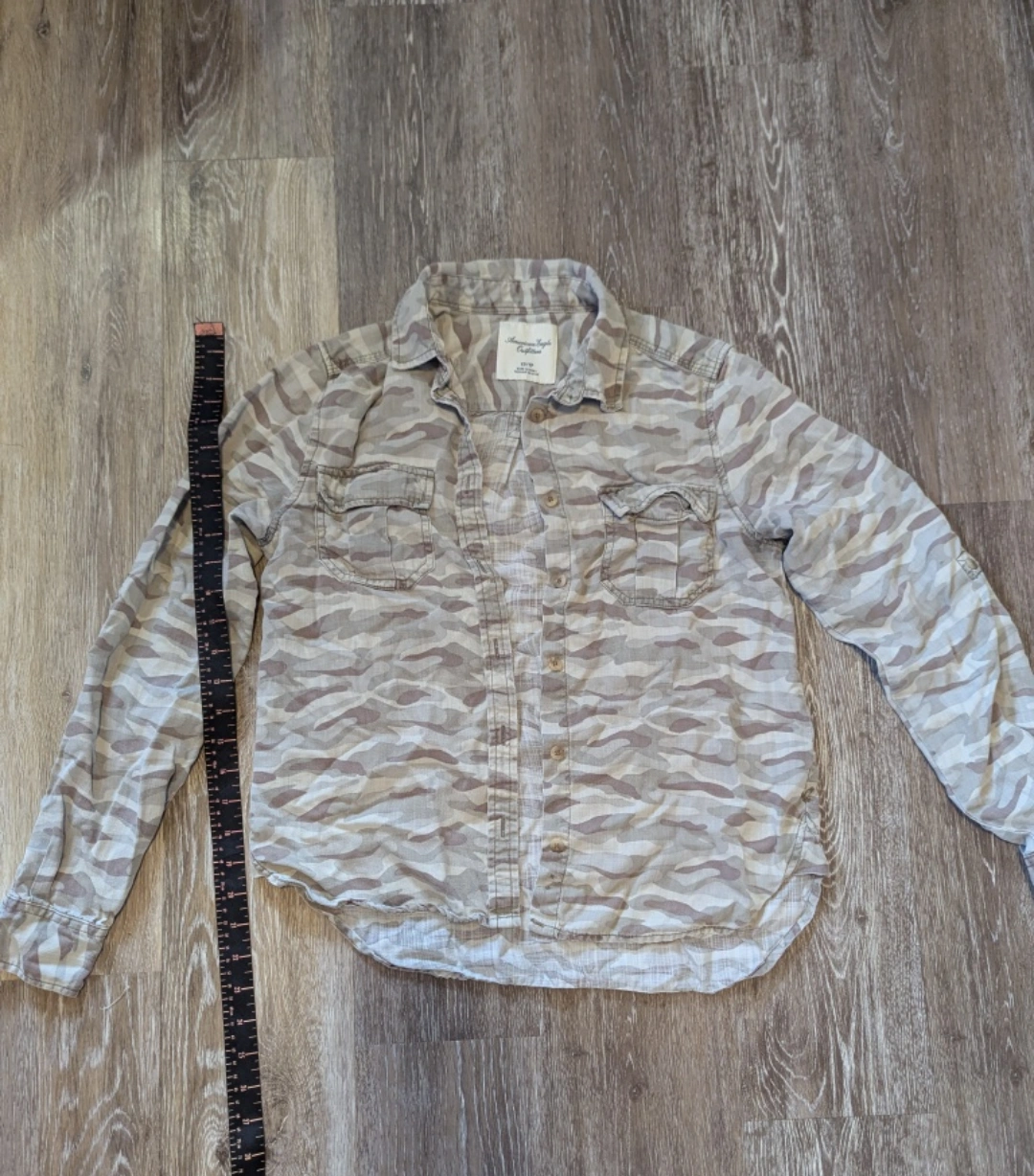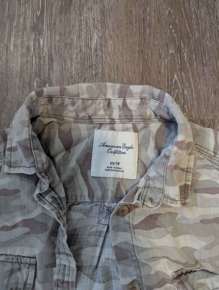 Women's American Eagle Outfitters button-up shirt. Size XS/TP. Camouflage pattern. Long sleeves. Two chest pockets.