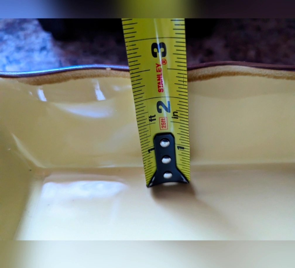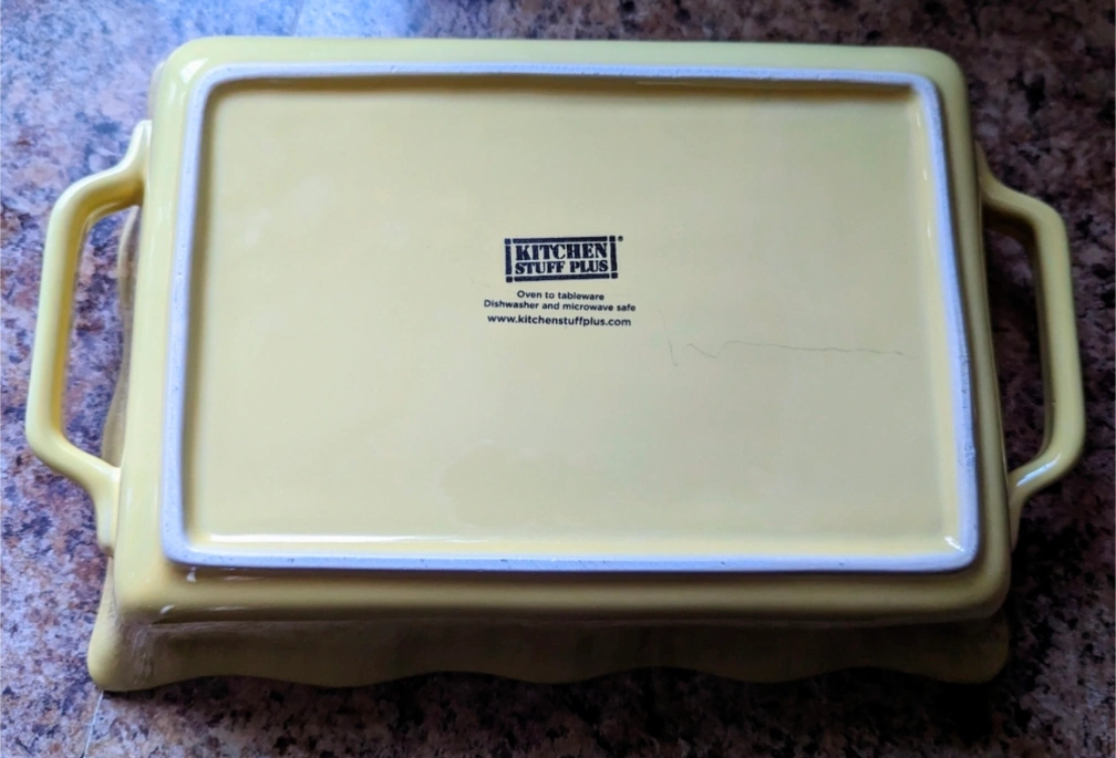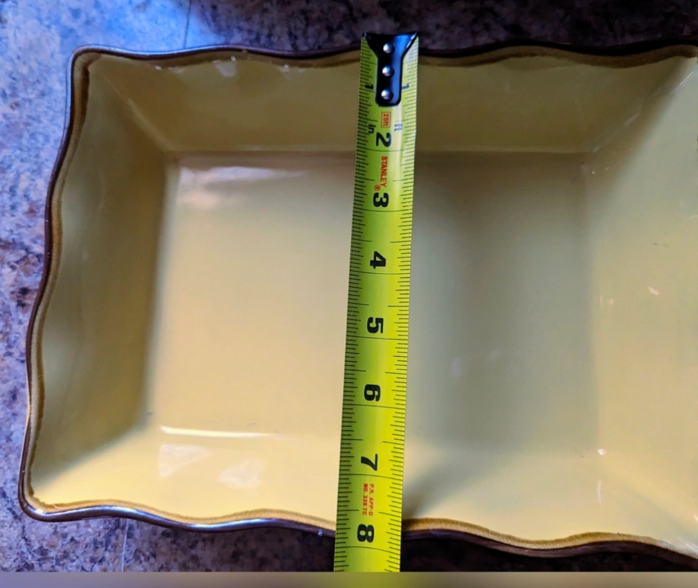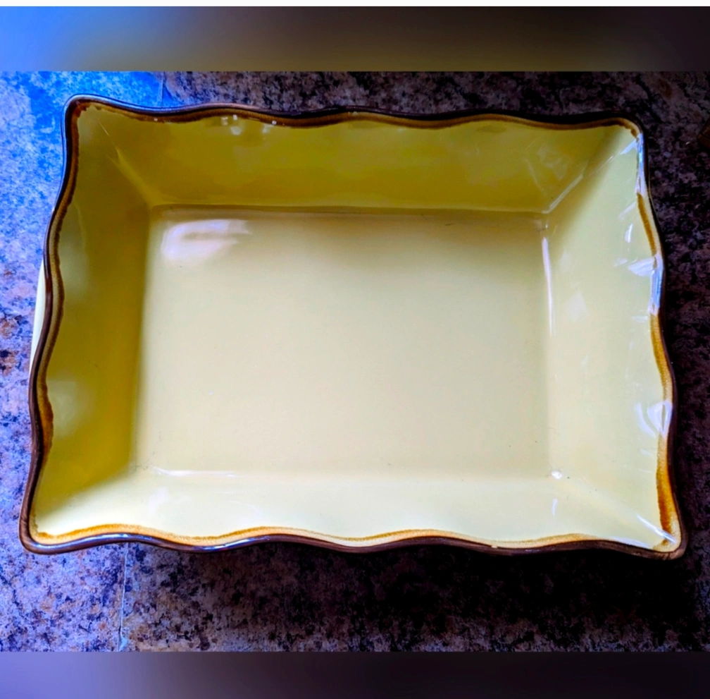 Yellow ceramic baking dish. Brown trim. Measures approximately 11 inches long and 7 inches wide. Oven to tableware. Dishwasher and microwave safe.