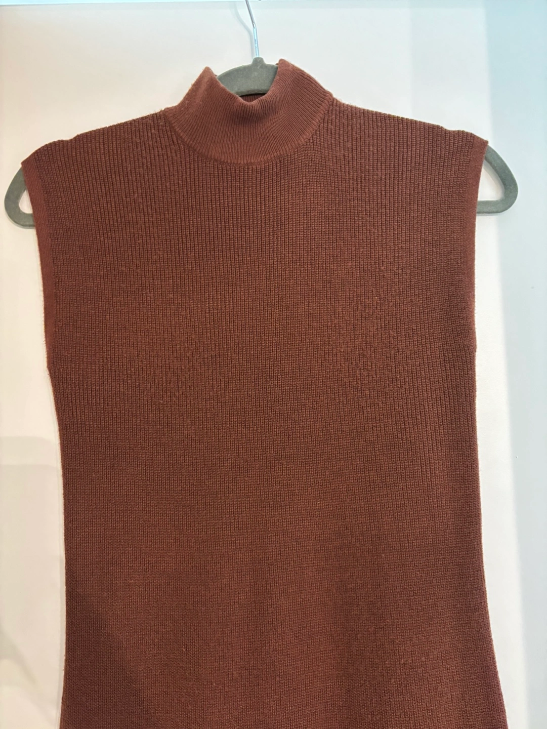 Sleeveless ribbed knit midi dress. Mock neck. Side slits. Rich brown colour. Perfect for fall or winter.