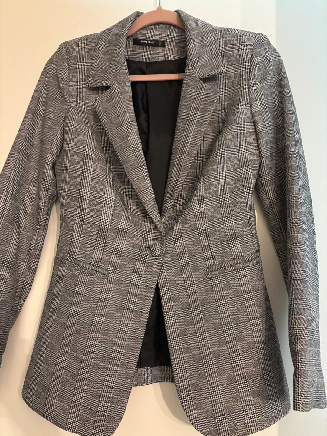 Women's tailored grey and white plaid blazer. Size small. Single button closure. Long sleeves. Pepped-up hem.
