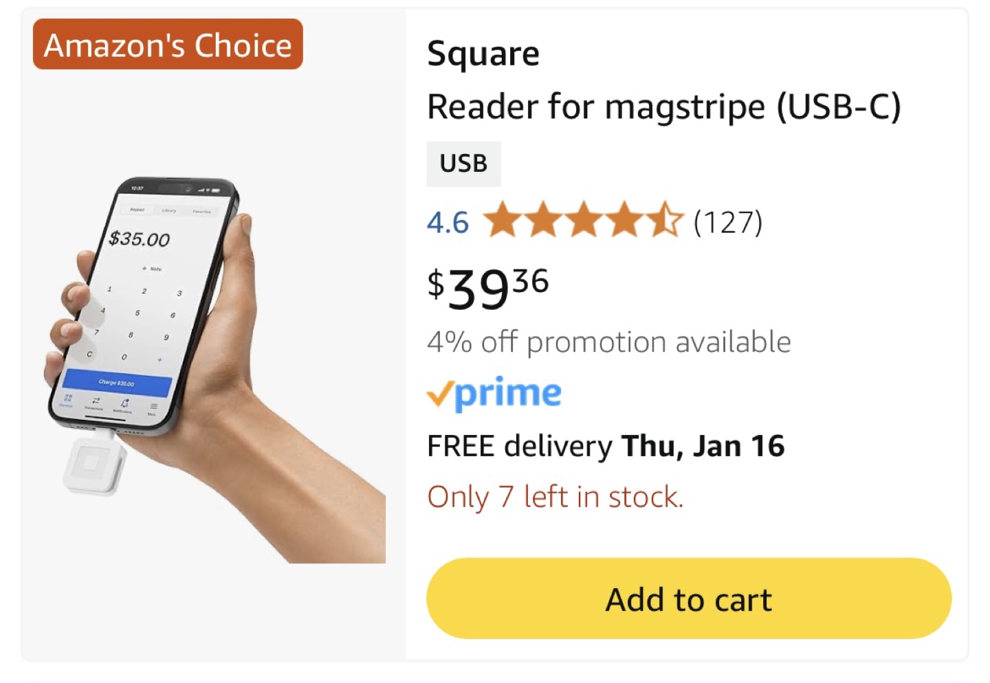 1 / 41 / 4Buy & SellSquare Reader for magstripe (USB-C)Square Reader for magstripe (USB-C)$25Compact card reader. USB-C connection. Accepts magnetic-stripe cards. Works with Square app. New.ConditionNewBrandSquareWHERE TO MEETCheck LocationView MapSELLERverifiedBarbCalder812 reviews0 chats·0 favorites·9 viewsSEND CHAT TO SELLERHi Barb! I’m interested in your listing.Hi Barb! I’m interested in your listing.Get the Karrot app to chatSign In to chat