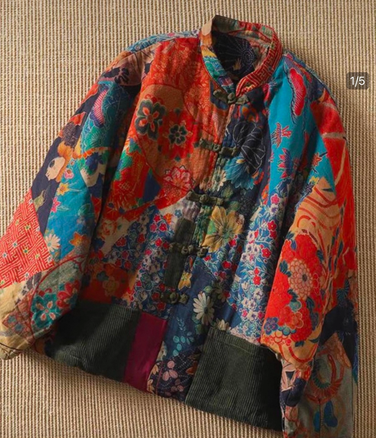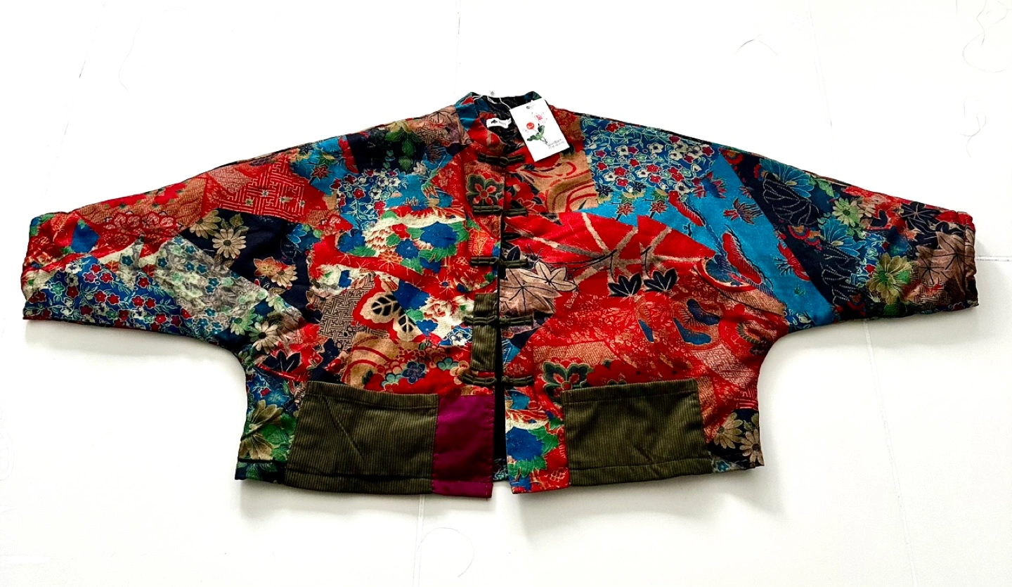 Unique quilted jacket. Features a mandarin collar and frog button closures. Oversized style fit. Bat sleeves. Patchwork design with various floral and geometric patterns. Multiple colours, predominantly red, blue, and orange. Two pockets. Lightweight. Soft and warm. Oversized style: Fits Breast from 36” to max 54” due to the bat sleeves style