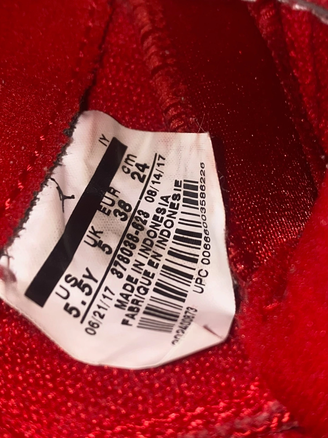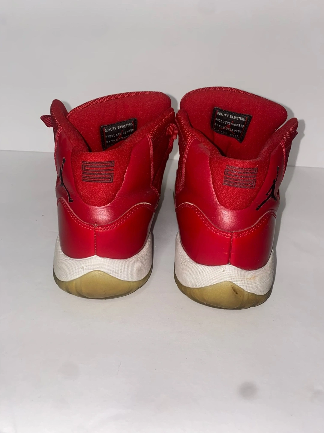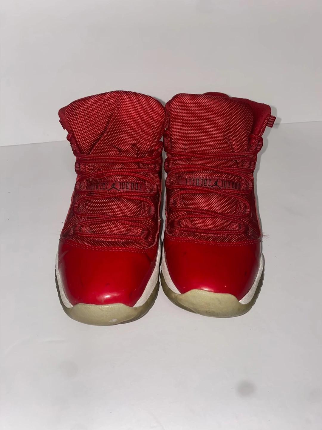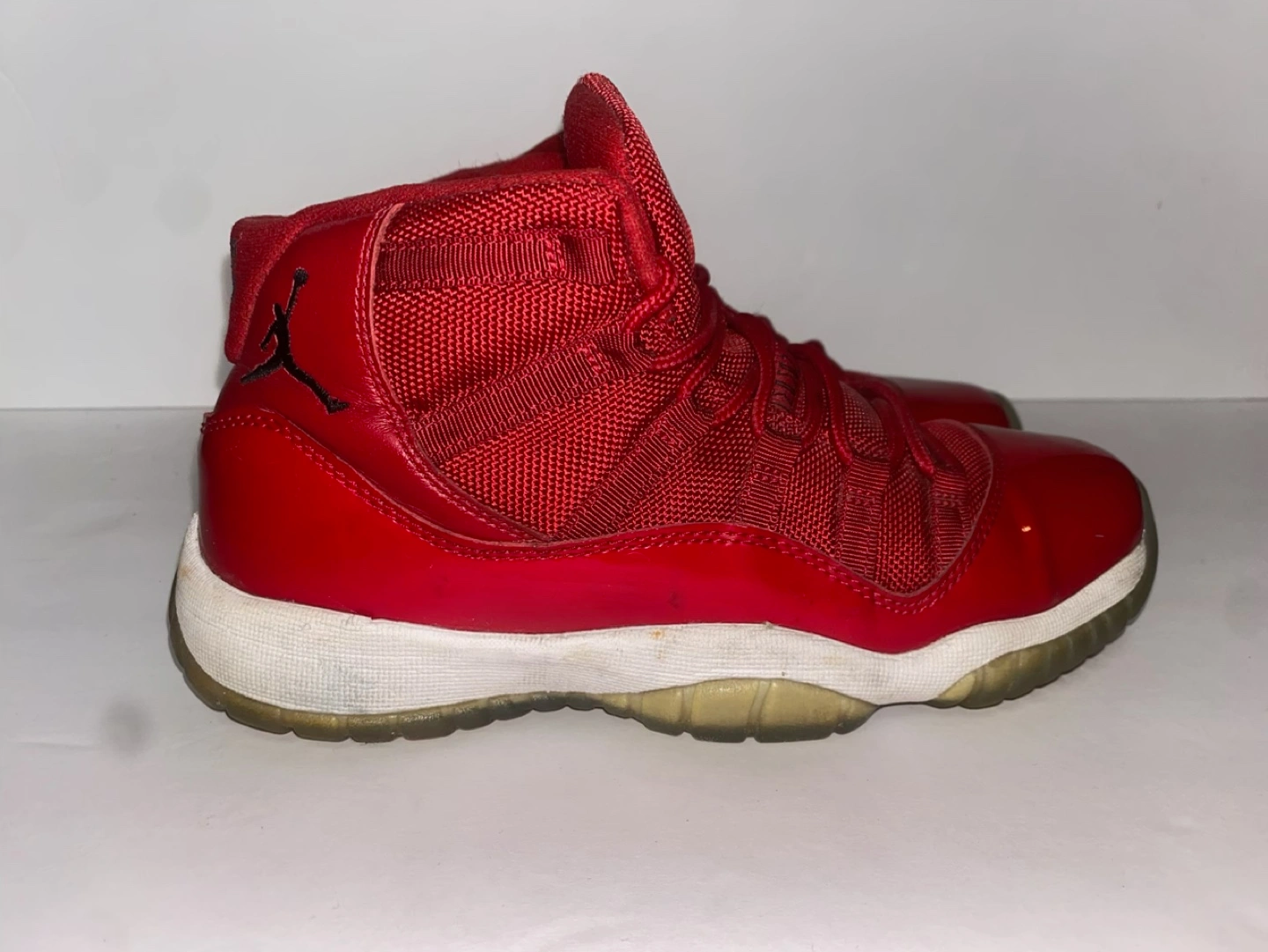 Girls' Grade School size 5.5Y Air Jordan 11 Retro in Gym Red. Red patent leather and mesh upper. White midsole and translucent outsole. Made in Indonesia.