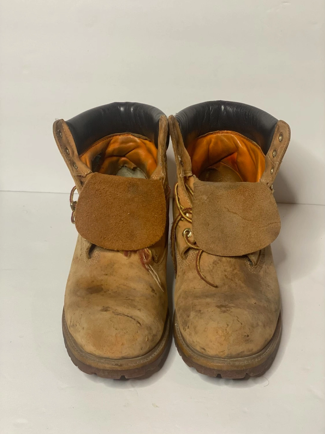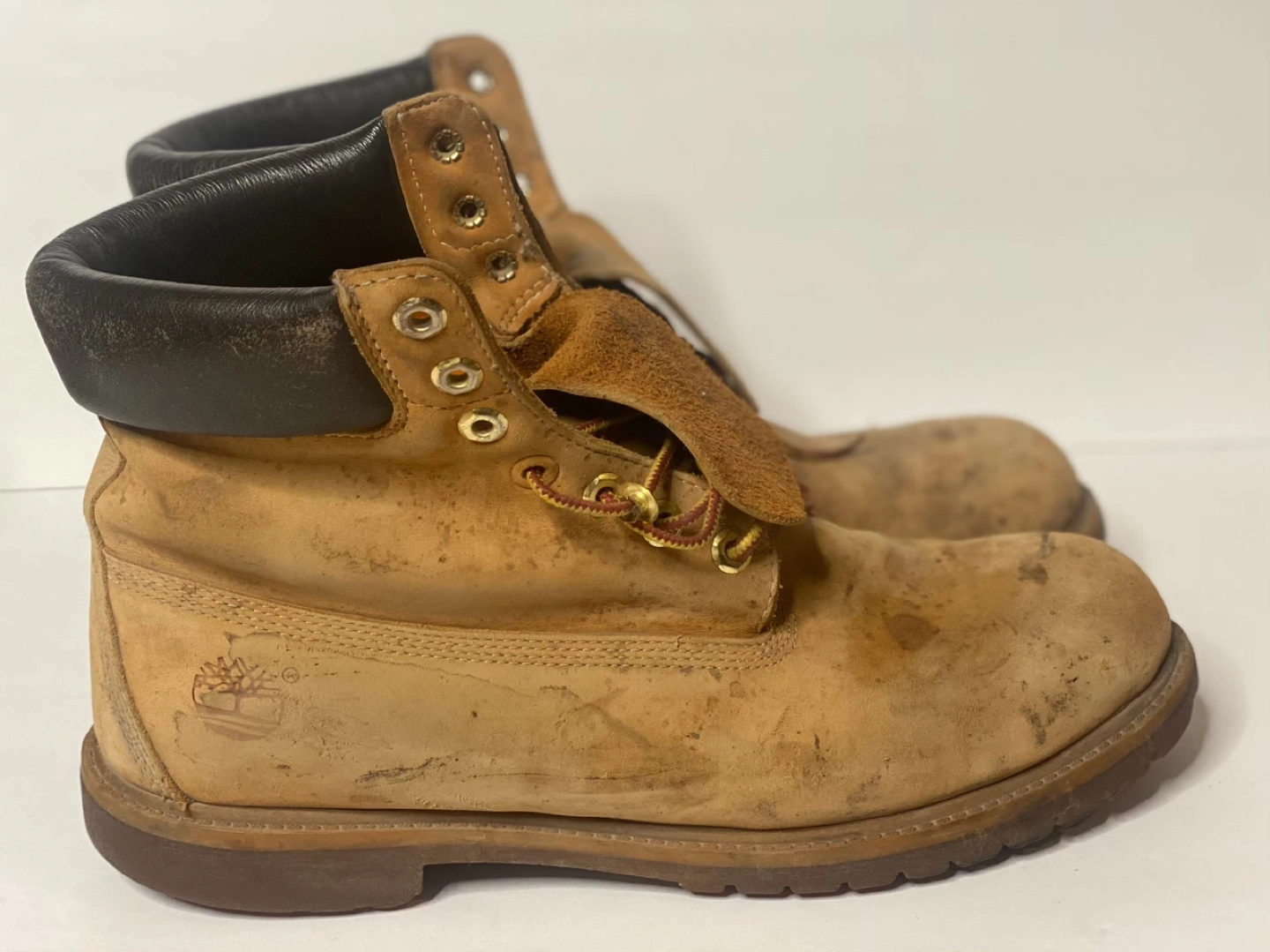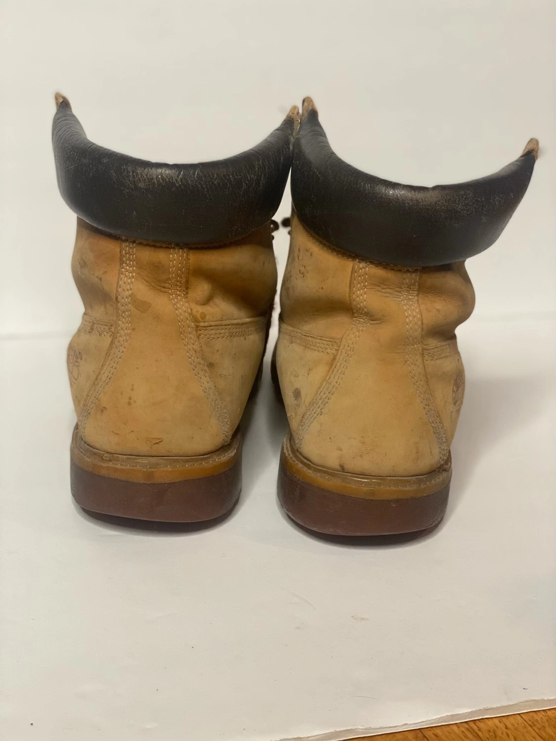 851Pre-owned Timberland boots. Wheat coloured leather. Men's size 11 Genuine leather upper. Man-made outsole and linings. Some wear and tear.