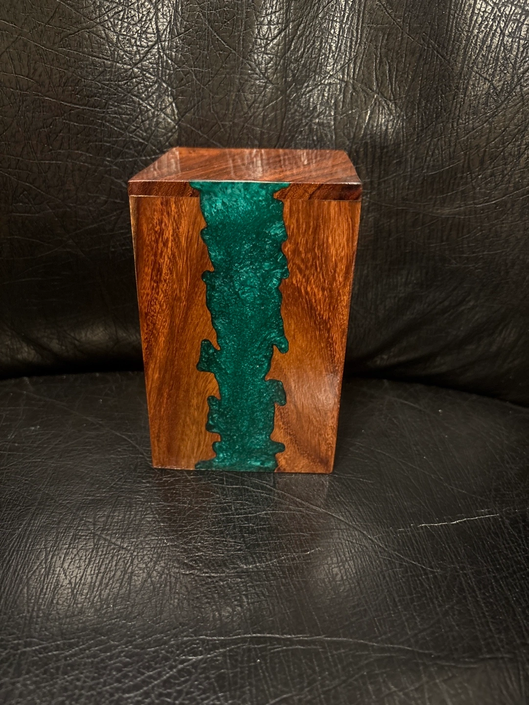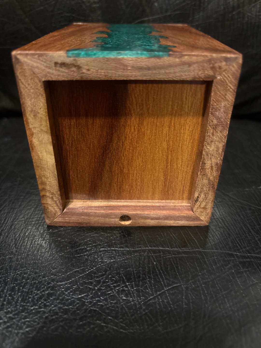 1000+Small wooden box. Features a teal resin inlay. Square shape. Wood is dark brown. Perfect for storing small items or as a decorative piece.this is almost filled with American Pennies it is sealed by a screw - these Pennie’s were placed in this and sealed but being sold hoping the person that likes the wood time capsule and is hopefully looking to sort the coins out! #DeclutterChallenge #WinWithUs Available by appt for pick up south of Bloor and Keele on Parkside drive by appt