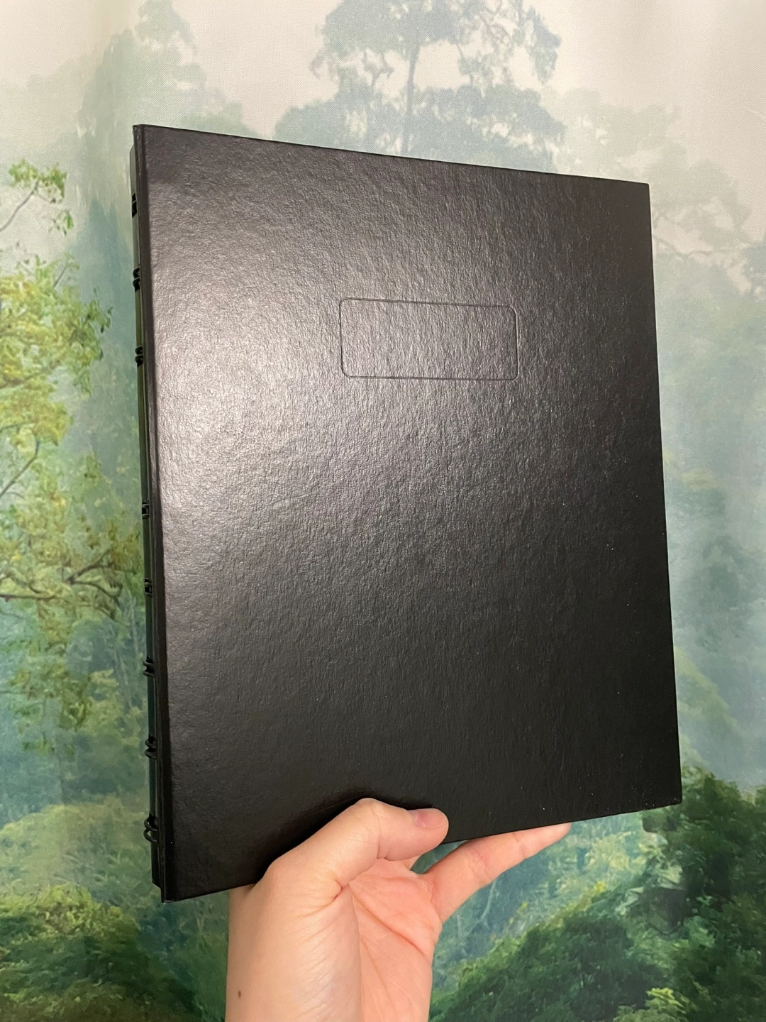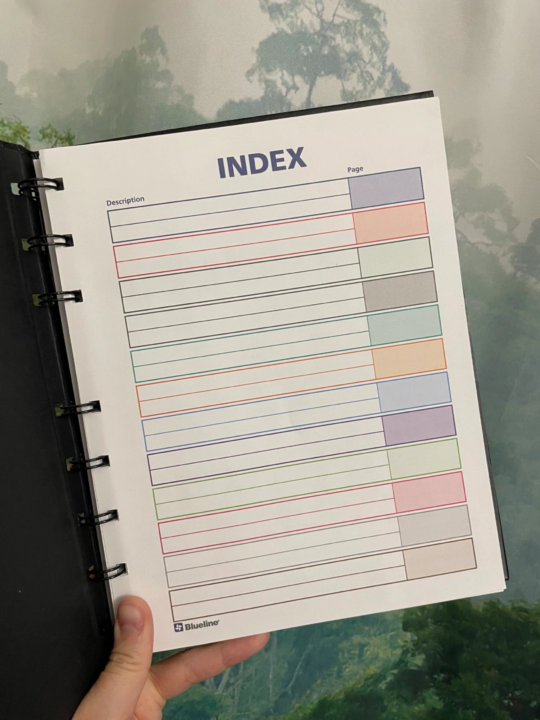 Spiral-bound notebook. Black cover. Includes index and dividers. Lined paper. Blank pages for notes and organization.