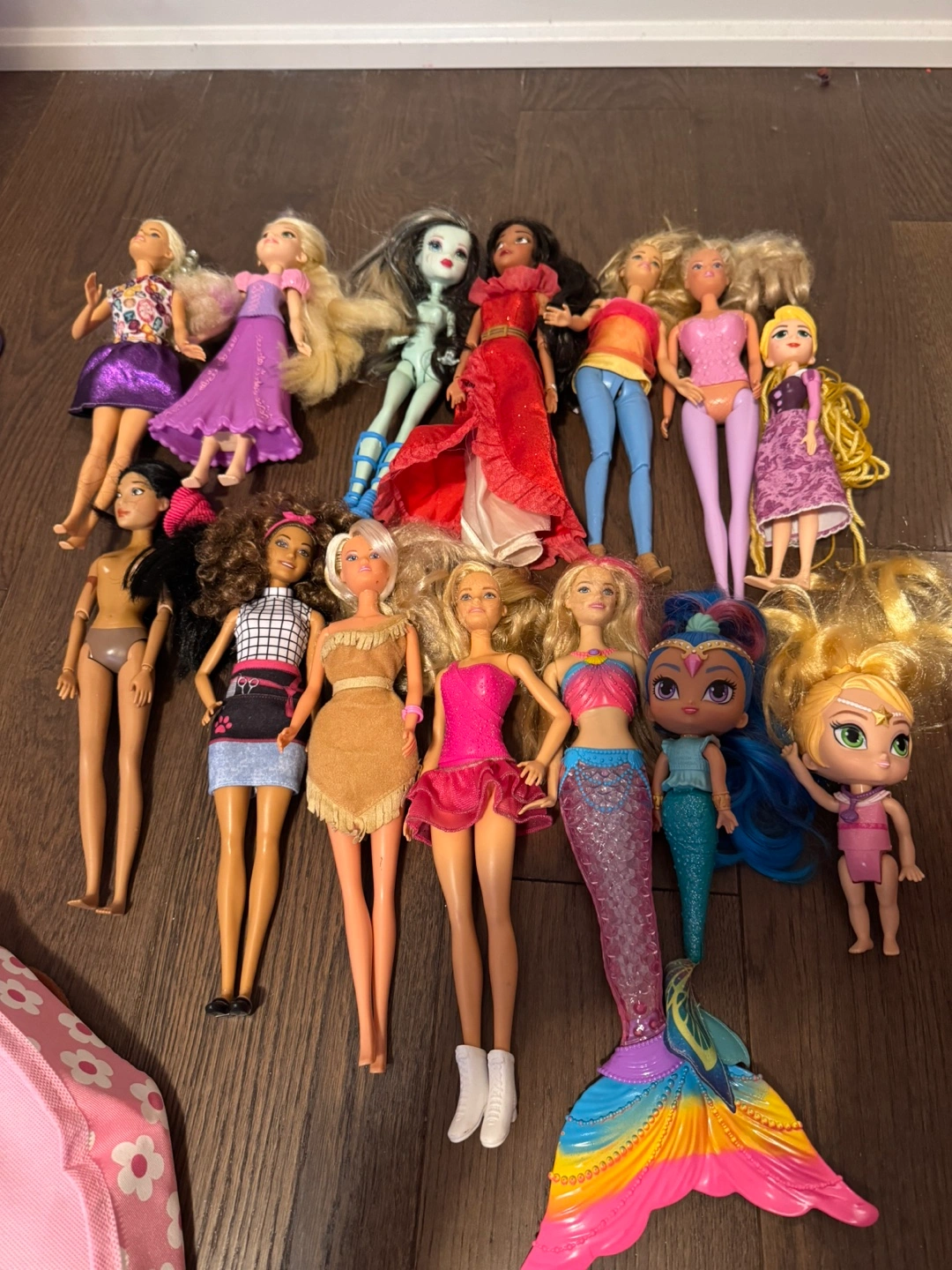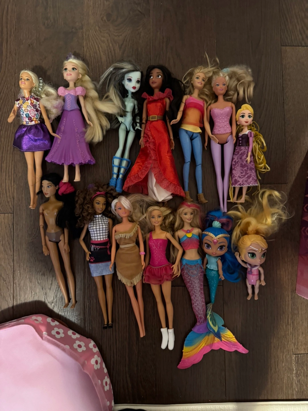 93Large collection of various dolls. Includes Disney Princesses, Monster High, Barbie, Shimmer and Shine, and more. Also included are three storage containers; one featuring Frozen characters and two others in pink. Please message me for pricing