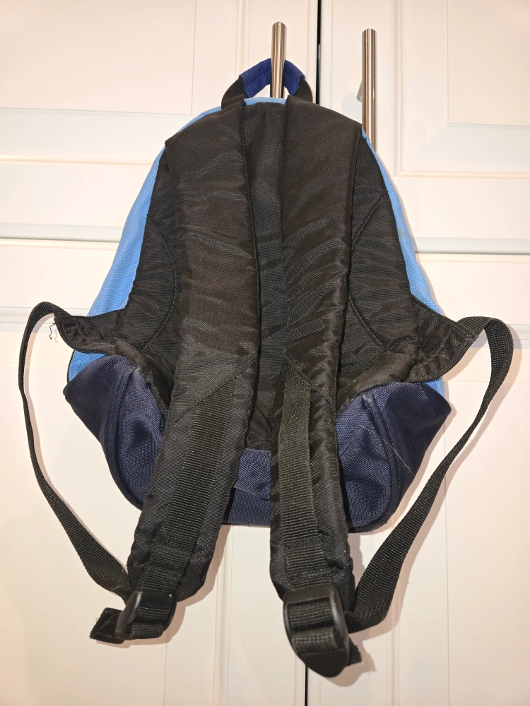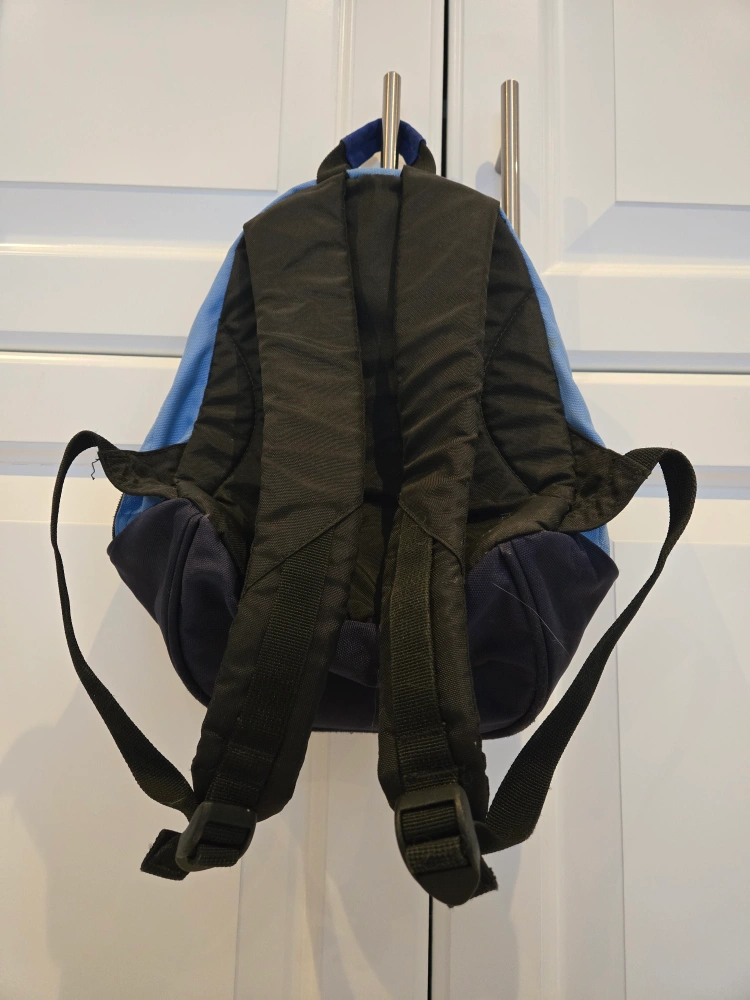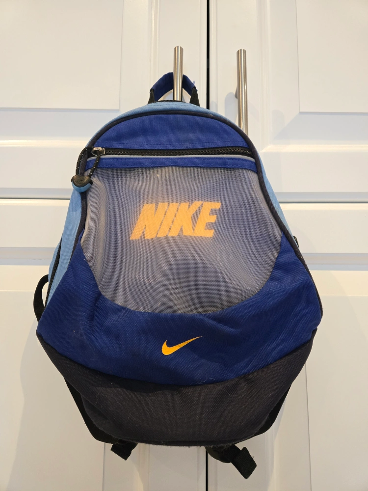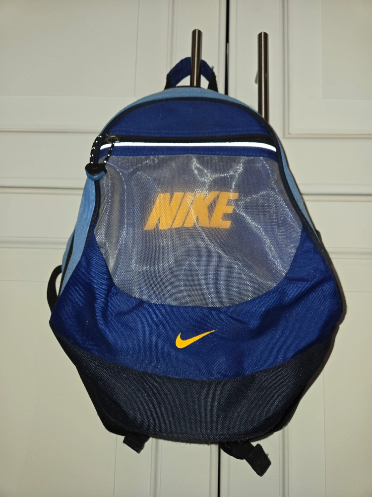 Small blue and navy Nike backpack. Features mesh pocket with Nike logo. Adjustable straps. Perfect for kids or a small everyday bag.