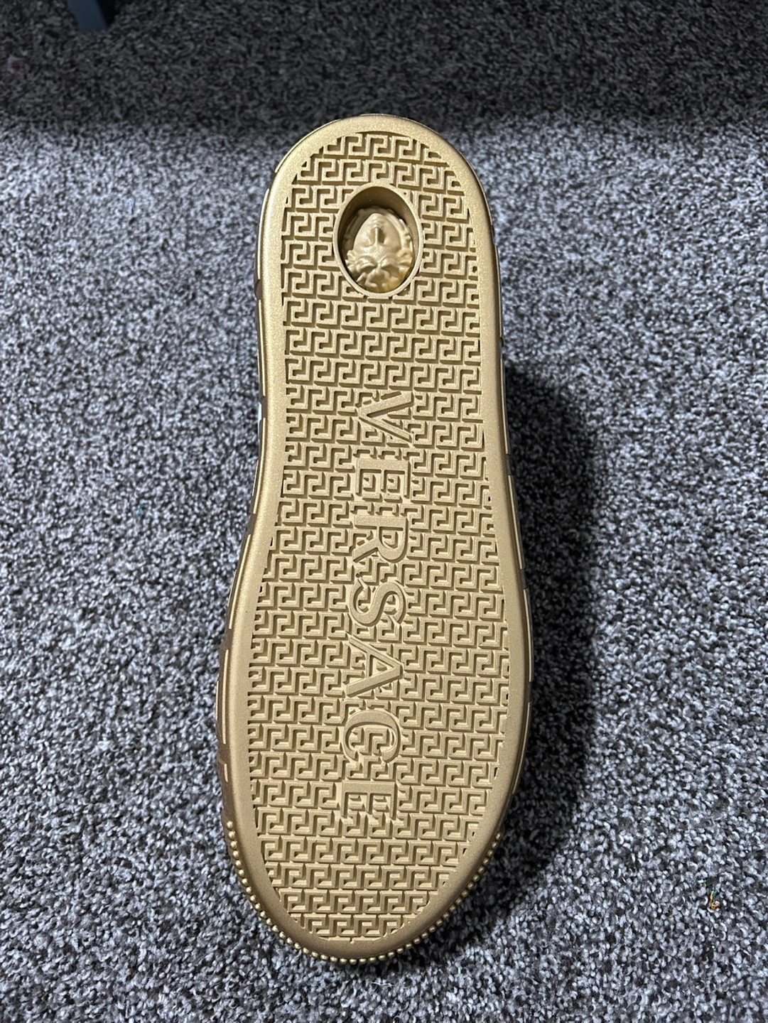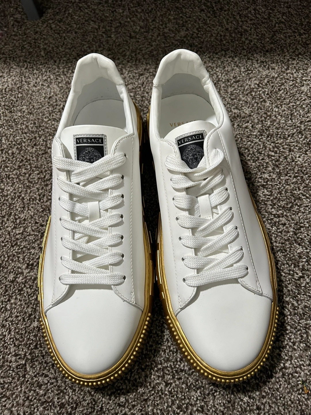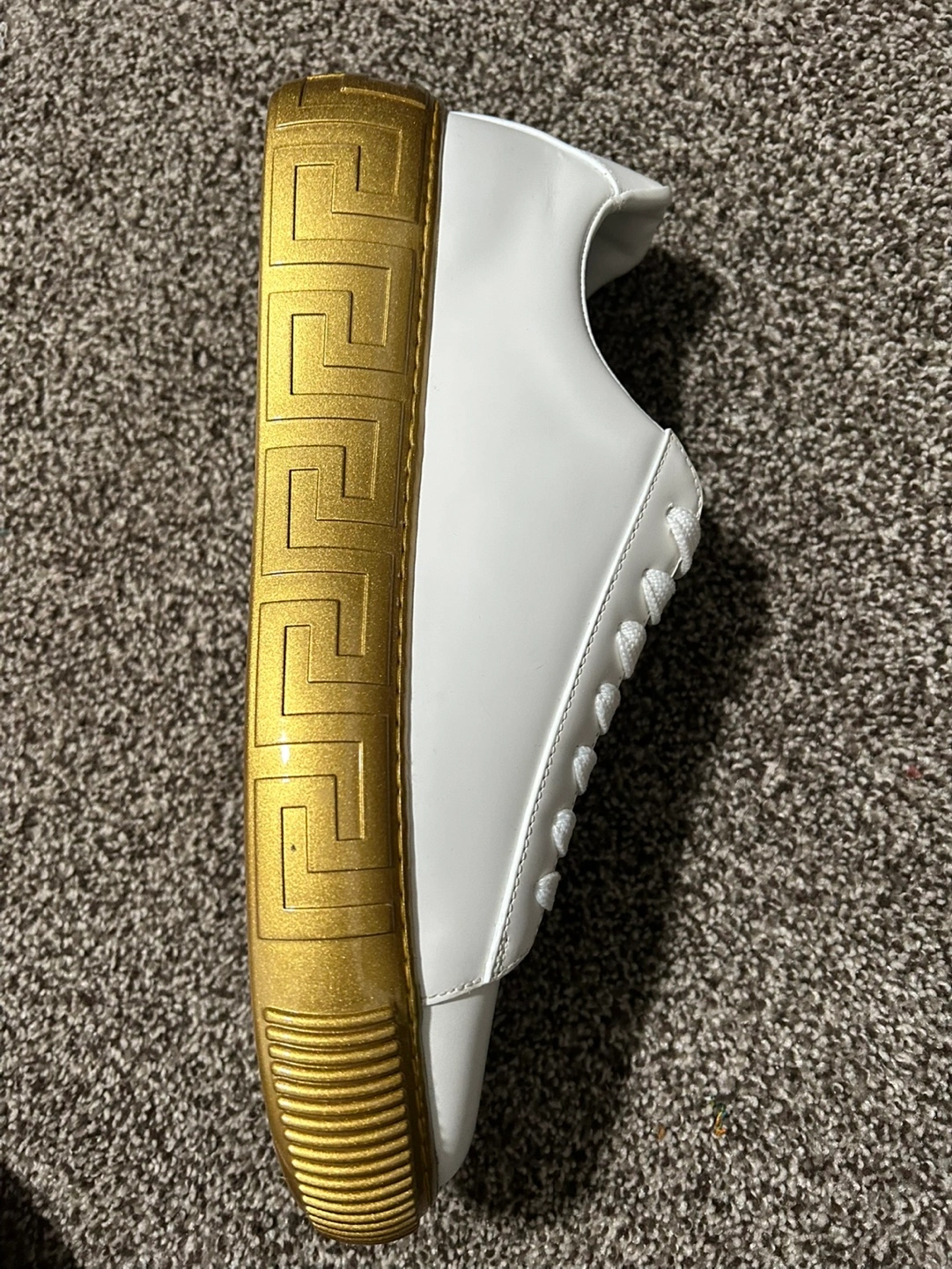34Men's white leather low-top sneakers. Gold Greek key pattern detail on the sole. Lace-up closure. Brand new Doesn’t come with box and dust bag.
