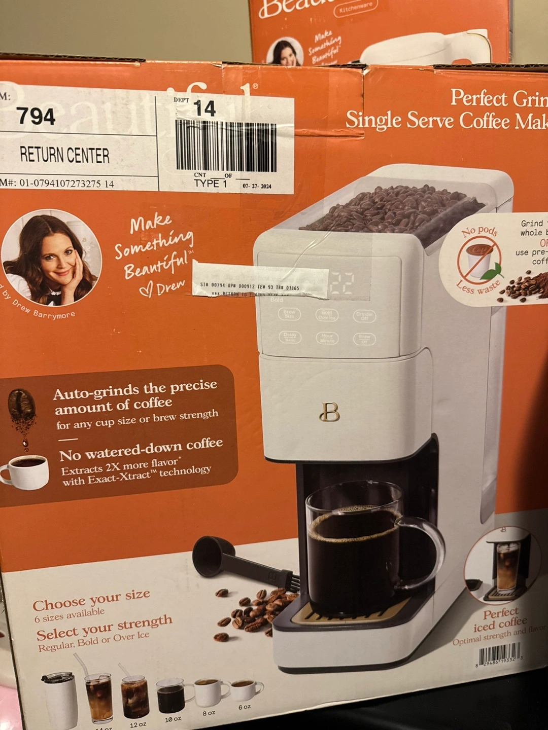 Brand new, in box. Perfect Grind Single Serve Coffee Maker. Auto-grinds precise amount of coffee for any cup size or brew strength. No watered-down coffee. Extracts 2X more flavor with Exact-Xtract technology. Choose your size: 6 sizes available. Select your strength: Regular, Bold or Over Ice.