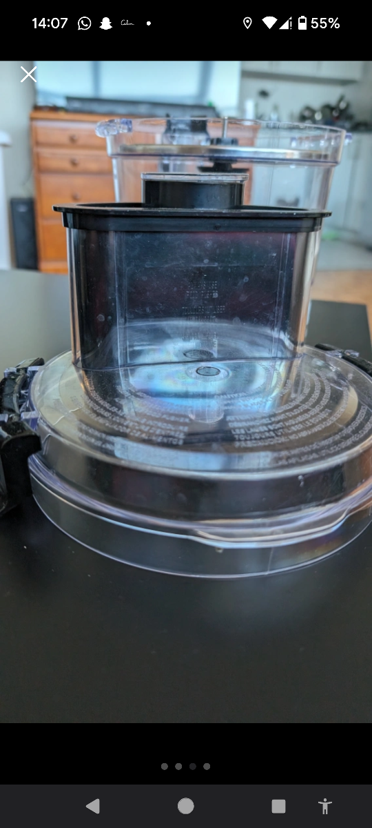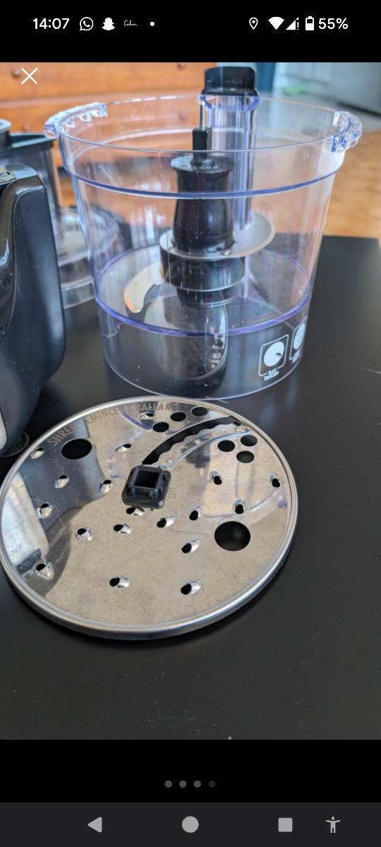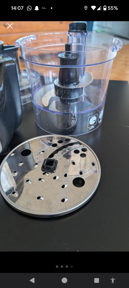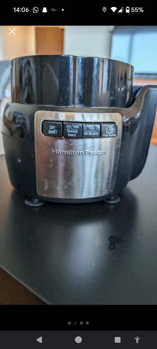 Used Hamilton Beach food processor. 10 cup capacity. Includes multiple attachments for slicing, shredding, pureeing, and more. Has a small crack in the end but does not impact the processor.