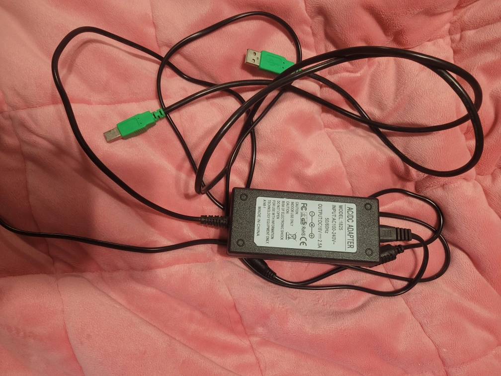 AC/DC adapter with multiple cables. Model 1825. Input: AC100-240V~ 50/60Hz. Output: DC18V 2.5A.