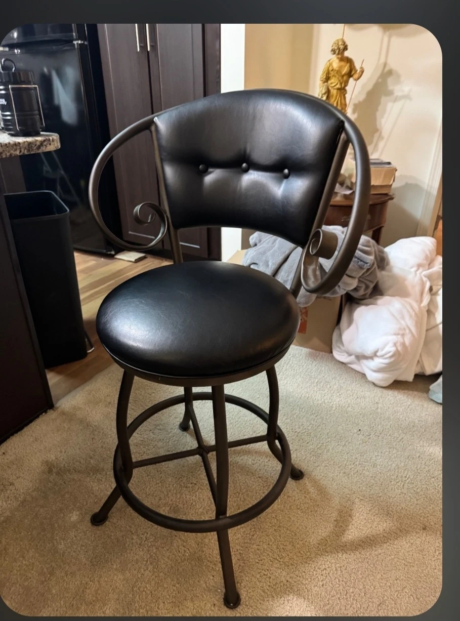 These two bar stools feature black faux leather upholstery and a metal frame. They swivel and have a comfortable, padded seat and backrest. These stools are great for a kitchen island or home bar.