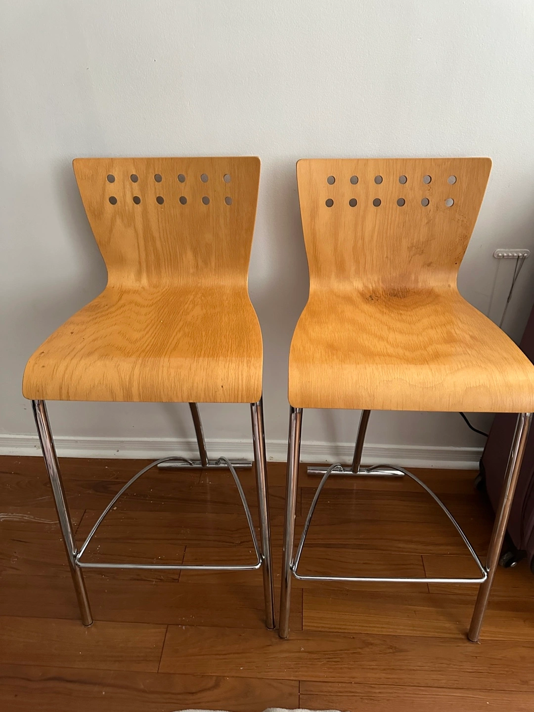 Set of two bar stools. Light wood seats and backs. Chrome legs and supports. Minimalist design. Good condition. ⚠️Check out my other listings for more. NEEDS to be gone by Feb 20th at the latest ‼️
