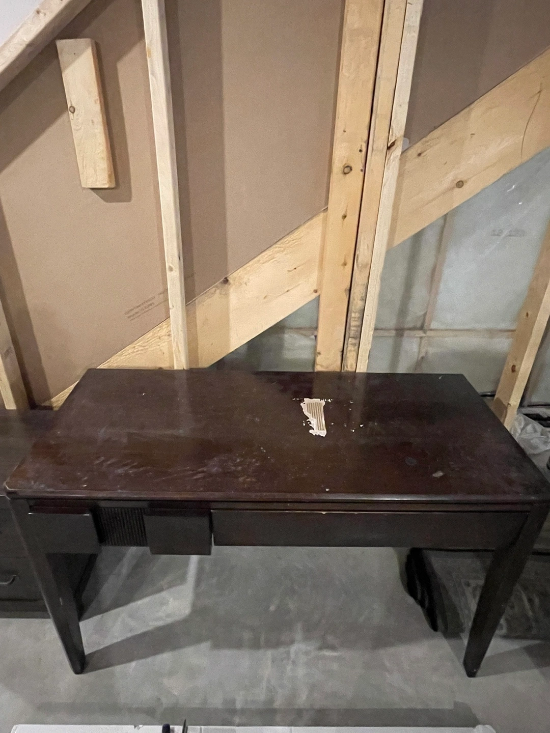 Simple dark brown wooden desk. One drawer. Minor damage to the top. Good for a small space. Needs a bit of work but durable.