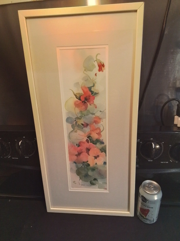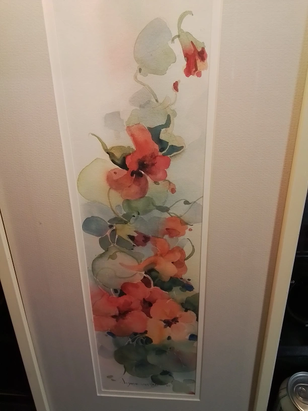 114Framed Watercolor Painting of Flowers by Josanne van Hees Beautiful framed watercolor painting. Features orange and red flowers. Artist signature visible. A lovely piece for your home. Measurements 11.5 x 23.25 Pickup at Young Street and Steels Ave