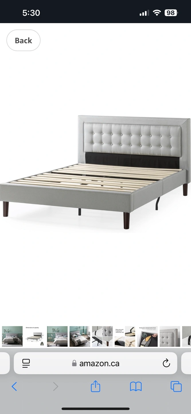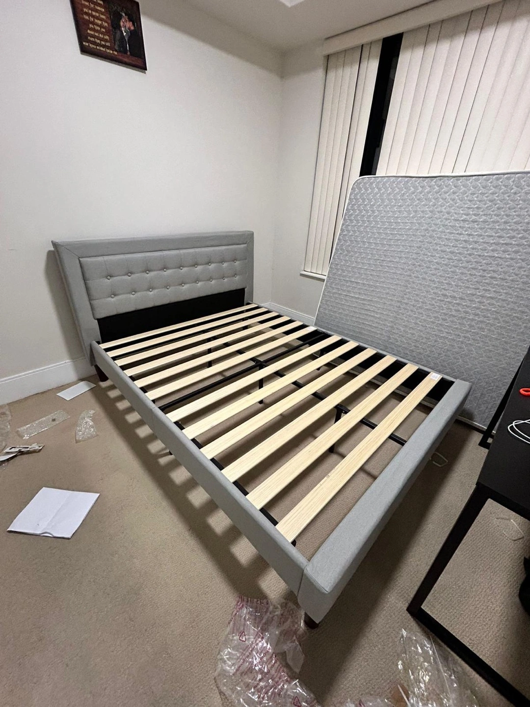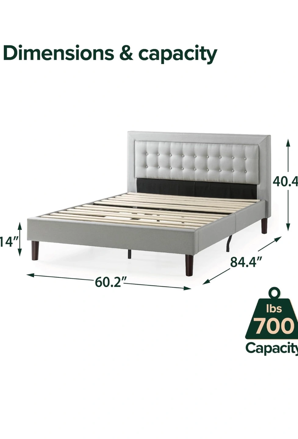 Queen size platform bed frame. Grey fabric upholstery. Wooden slat support. 700 lb weight capacity. Minimal assembly required. New Like condition. Full Size Cushion Headboard.