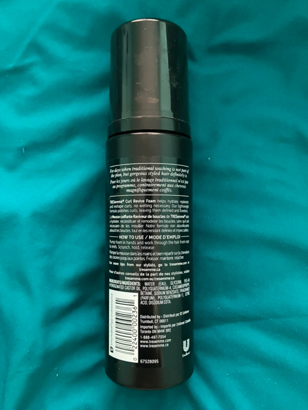 Styling foam for curly hair, used only 2-3 times. Hydrates, refreshes, and defines curls. 5 fl oz (147 mL).