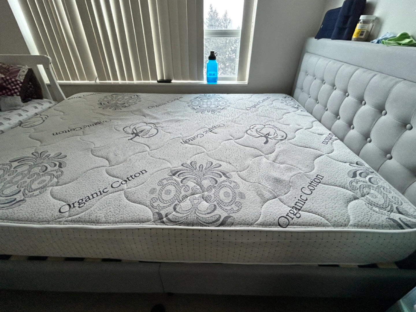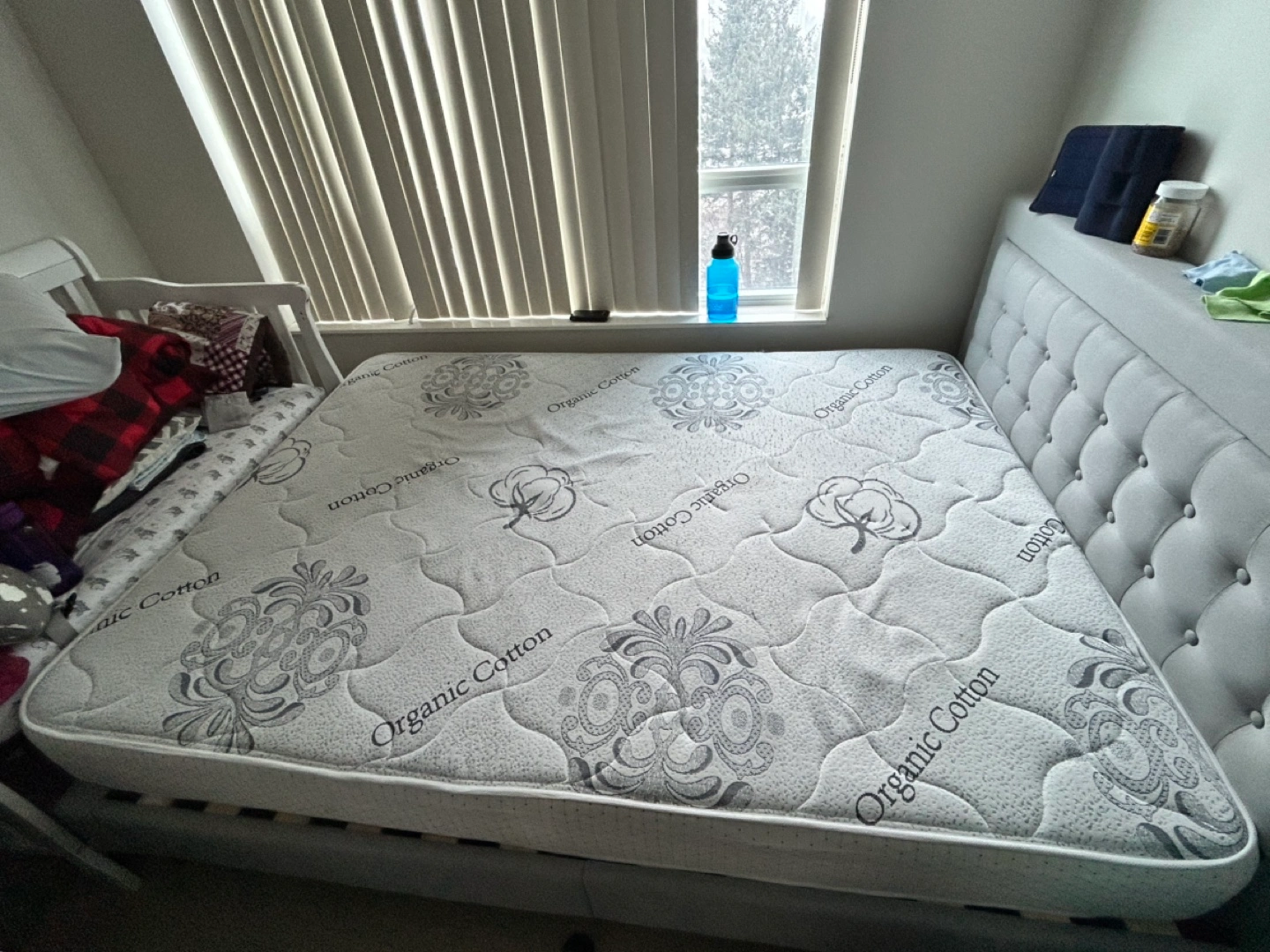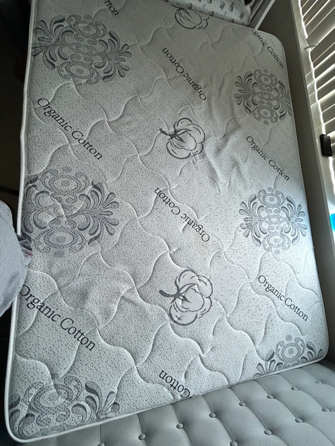 Queen-size mattress. Organic cotton. Features a quilted top with a subtle pattern. Excellent condition. Minor Stains on it.