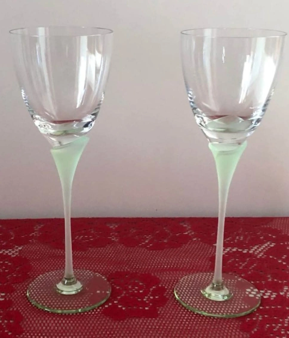 These tall glasses features a clear bowl and a frosted winter green stem.