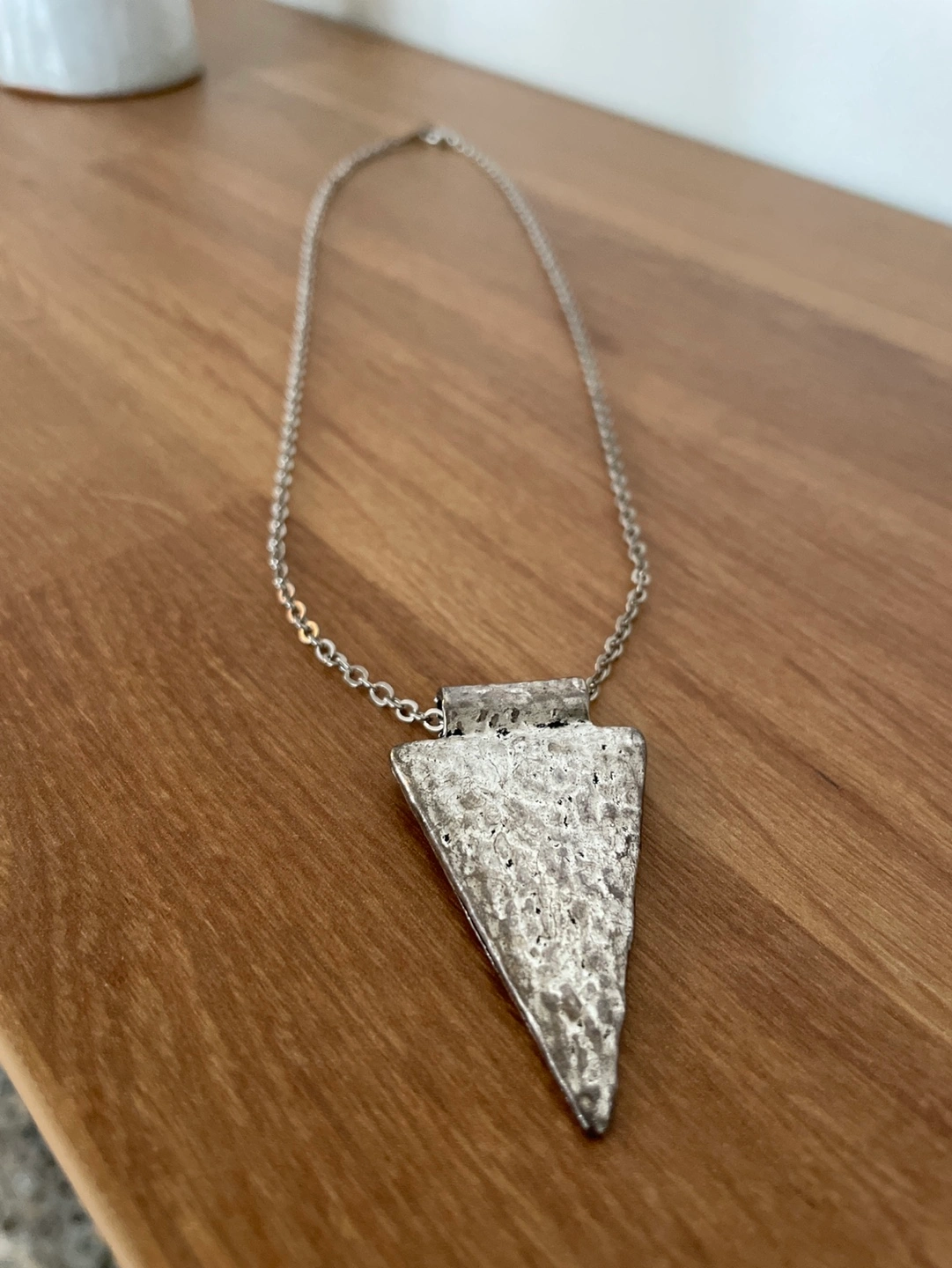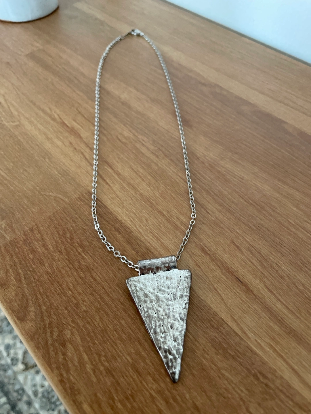Unique hammered silver triangle pendant necklace. Features a delicate chain and textured triangular charm. Great statement piece. New. Never used. Perfect condition.