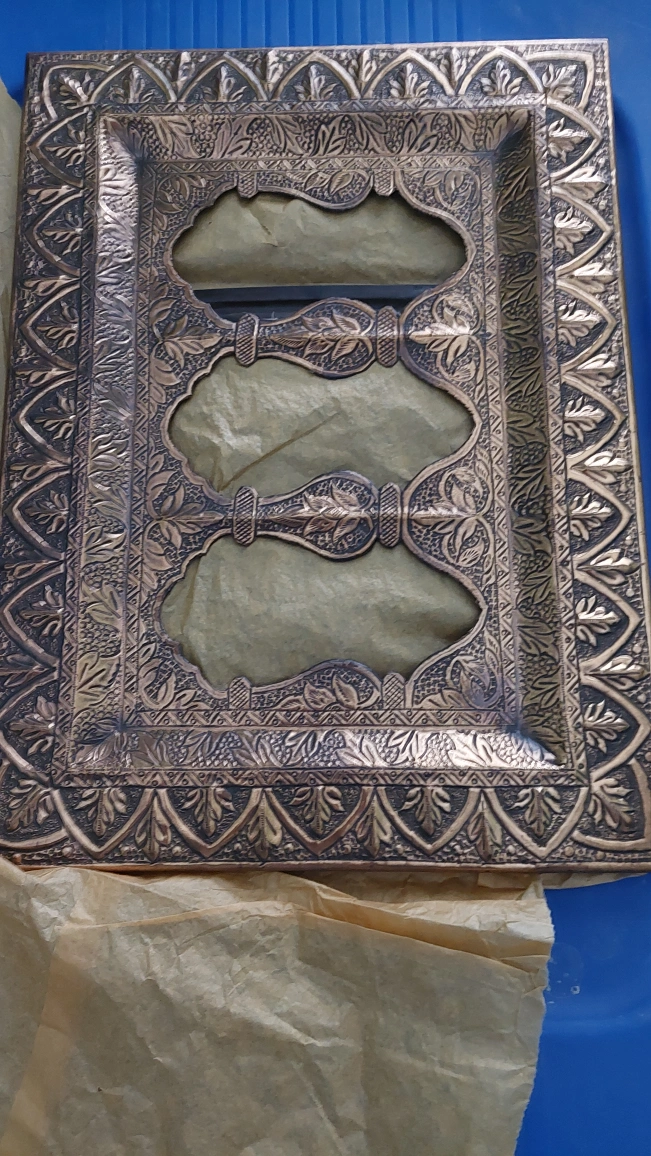 Ornate metal panel, possibly vintage. Intricate carvings and design. Three cutout sections. Features a dark, possibly bronze or copper finish. Suitable for wall hanging or other decorative purposes.