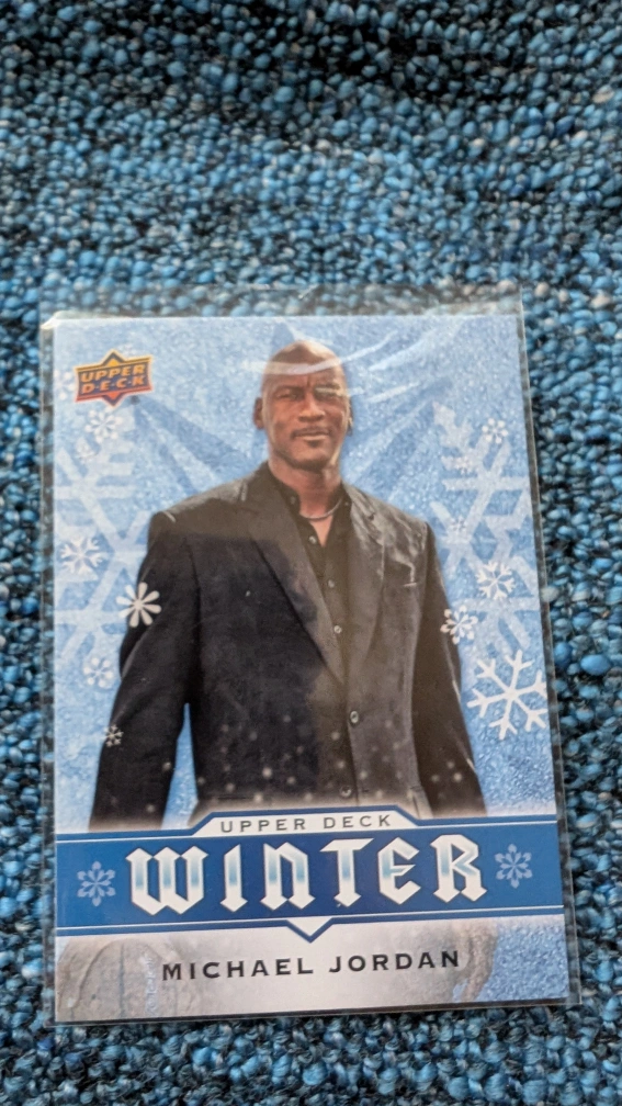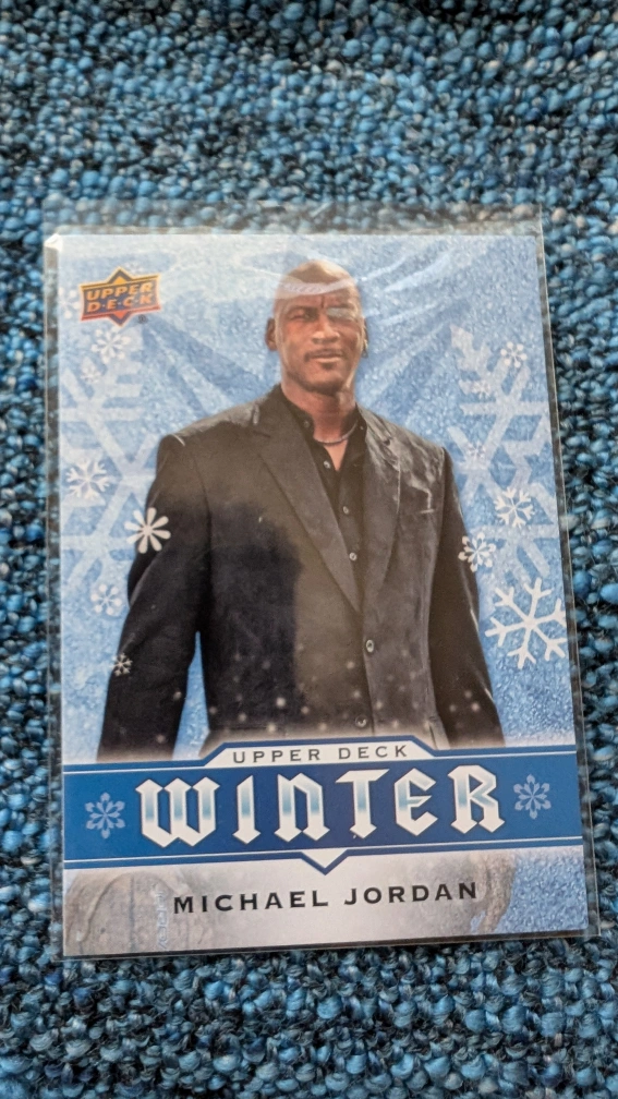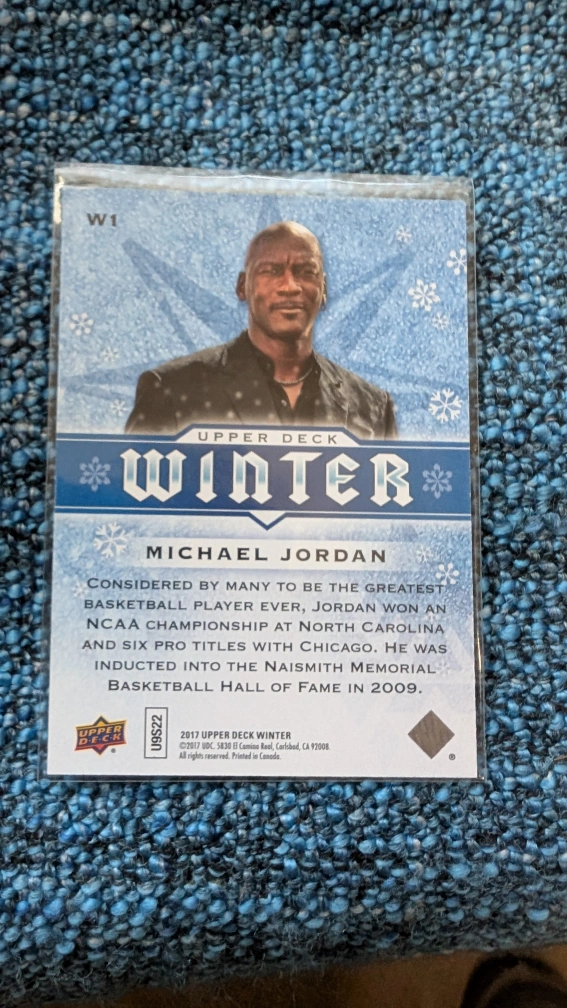 ππ-Collectible Michael Jordan trading card. Part of the 2017 Upper Deck Winter collection. Card number W1. Features a picture of Michael Jordan in a suit against a snowflake background.Asking 13.00 O.B.O. FCFS HURRY HURRY WILL NOT LAST LONG