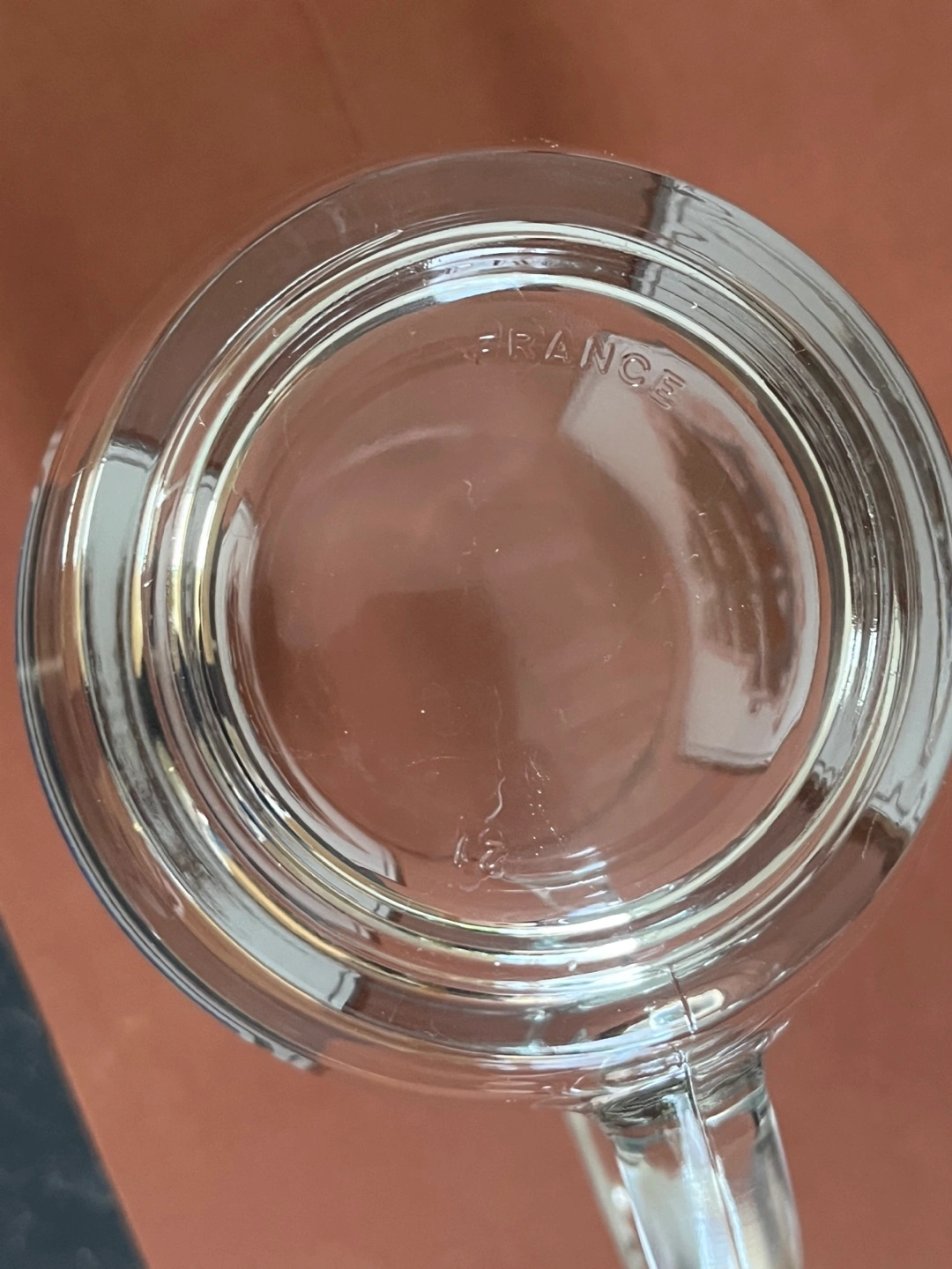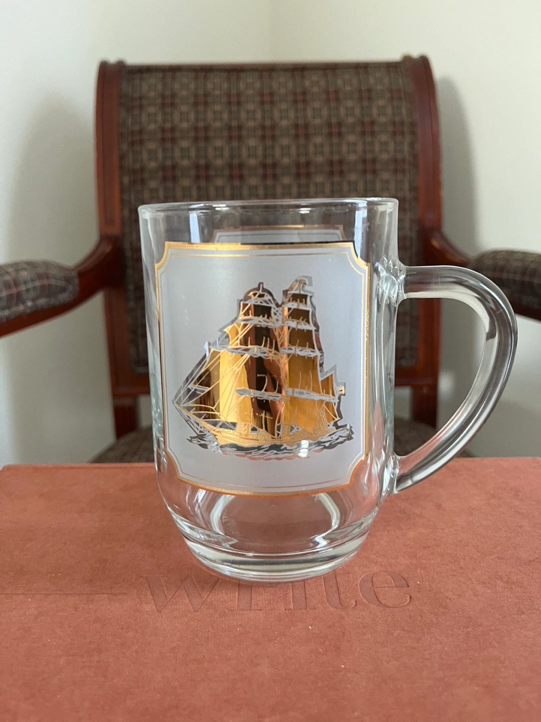 A vintage glass beer stein/beer mug with handle from Luminarc with a gold and frosted graphic of a nautical ship.