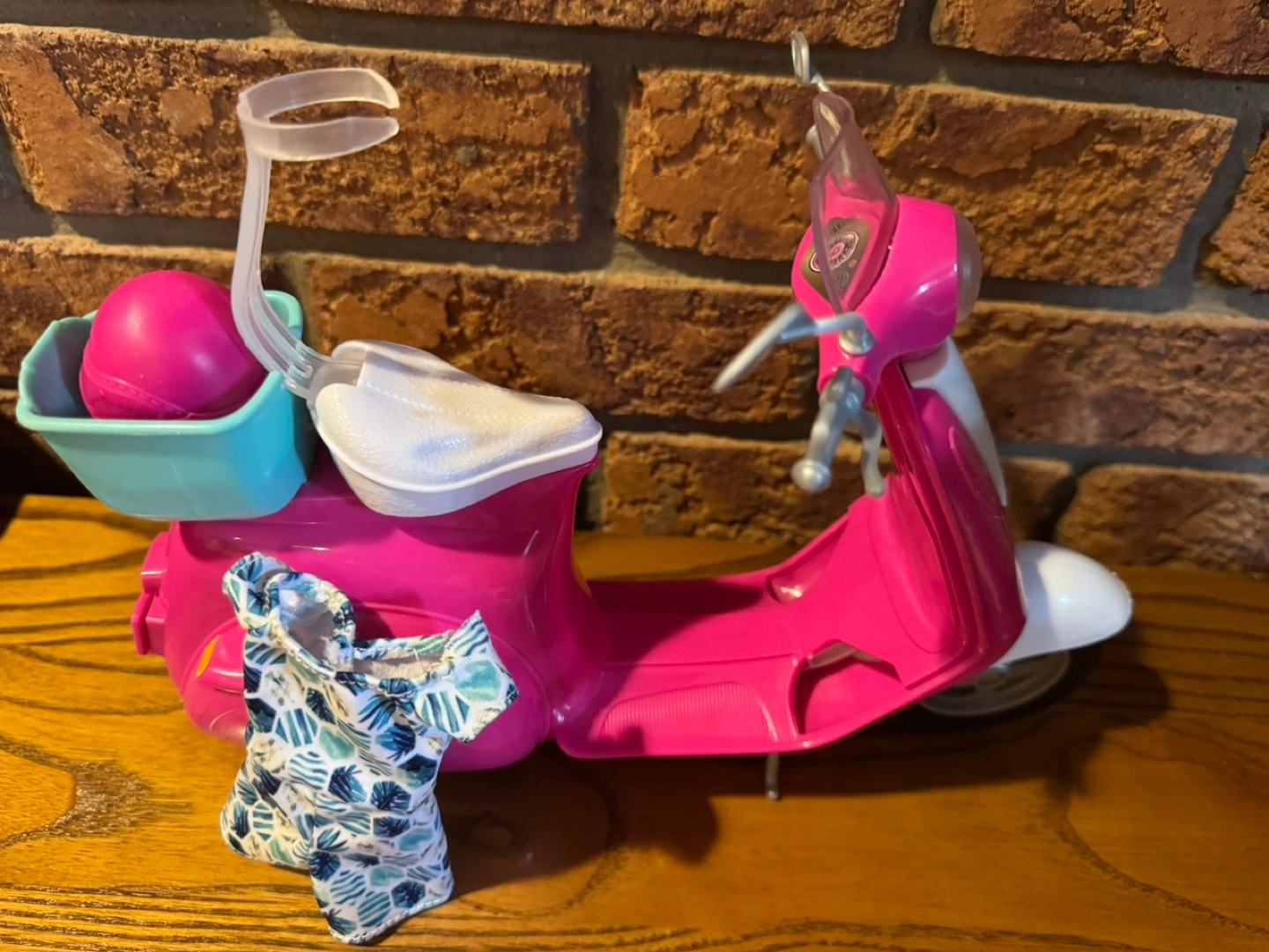 Pink plastic scooter. Includes helmet and a small dress. Unfortunately I don’t have the Barbie to go with it.