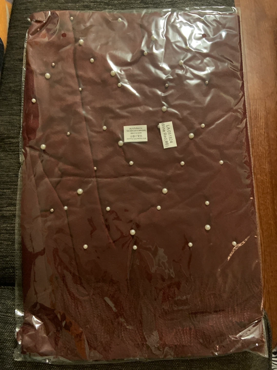 - Soft dark red/ burgundy/maroon scarf, embellished with silver stones and pearls. - Features a fringed hem. - Perfect for adding a touch of elegance to any outfit! - Care instructions: Hand wash in cold water. No wringing. Dry flat. - Also comes in pink and navy blue