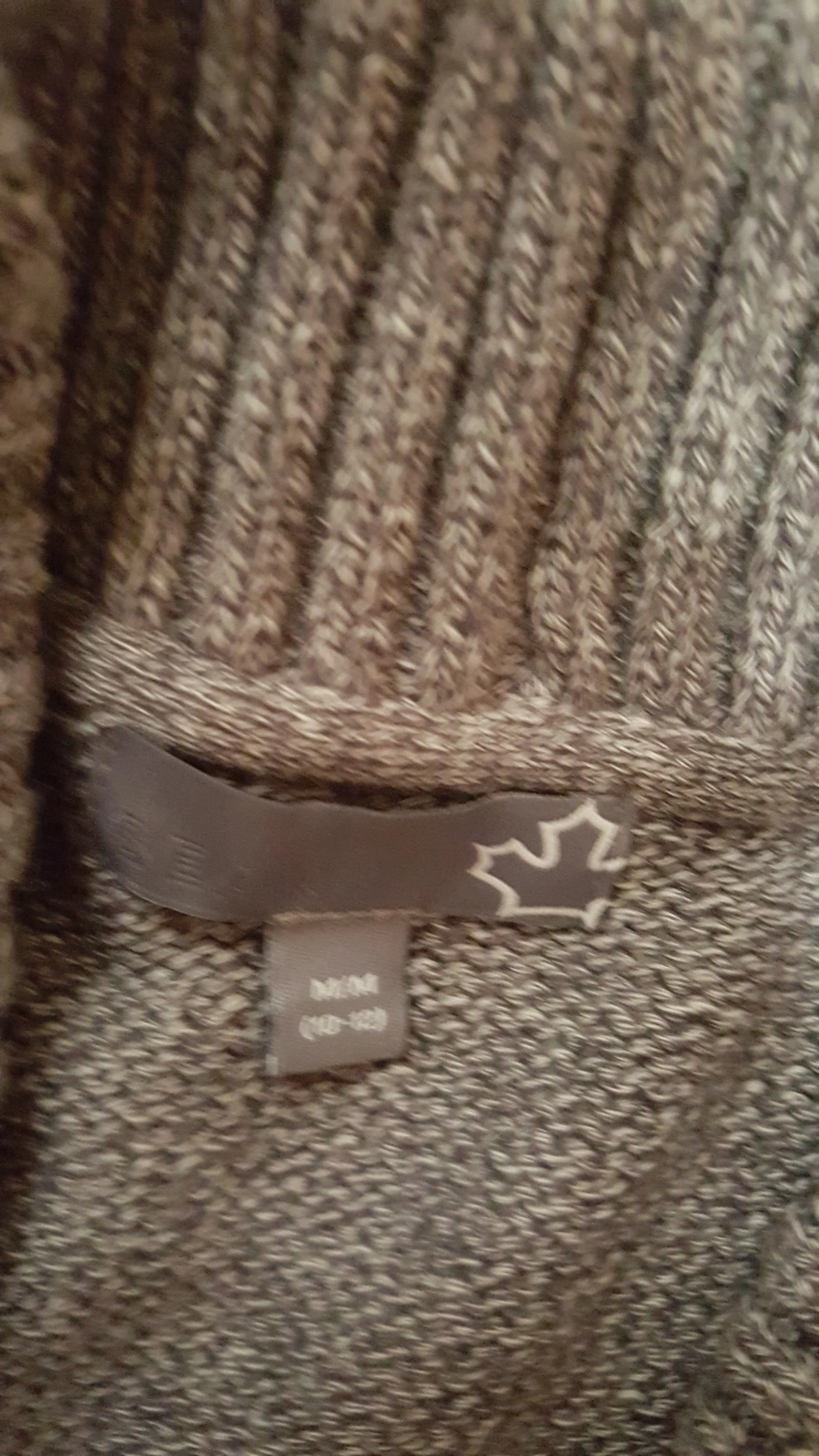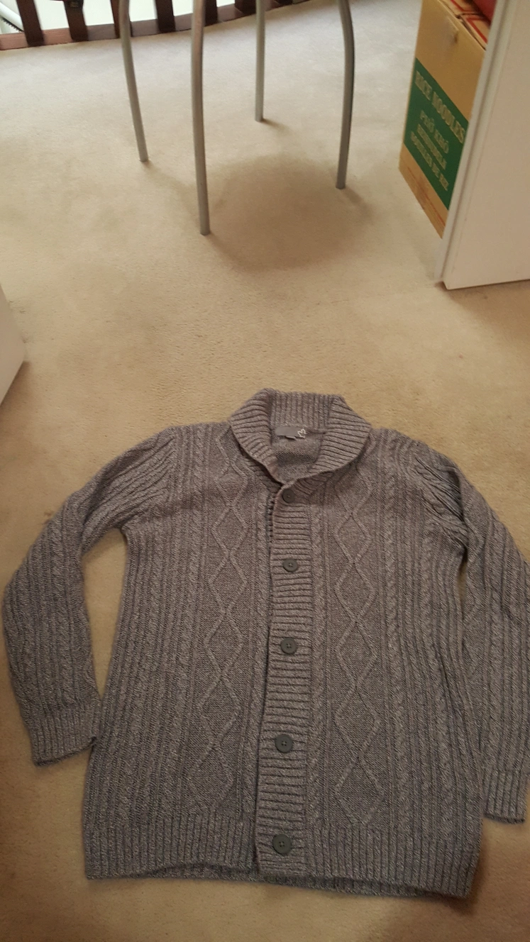 38Grey cable knit cardigan. Button closure. Collared. Size medium.