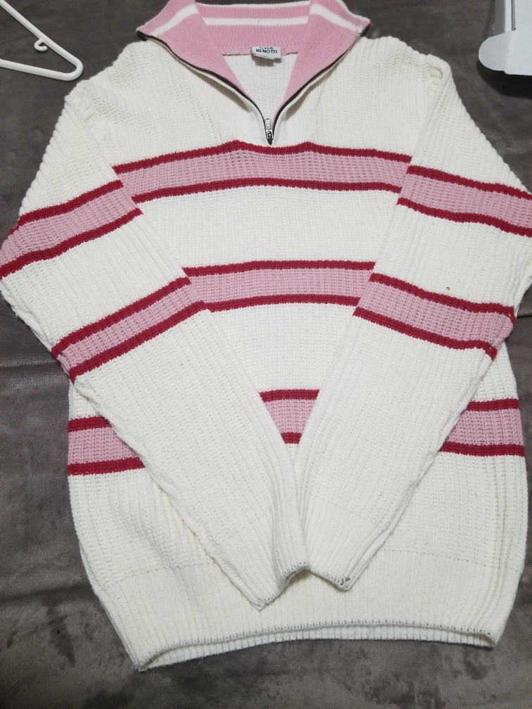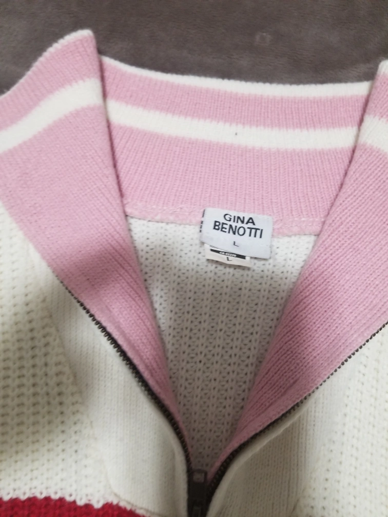 38Cream coloured women's size large sweater. Features pink and red stripes and a quarter zip. Long sleeves. Knit material.