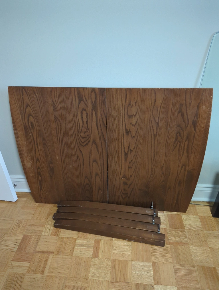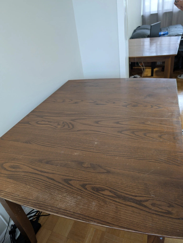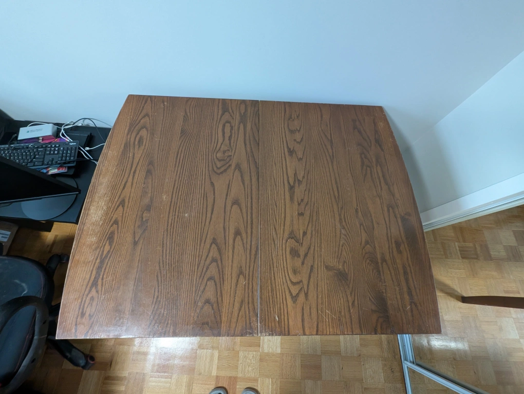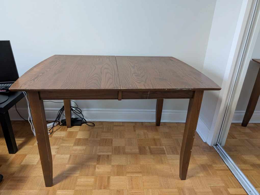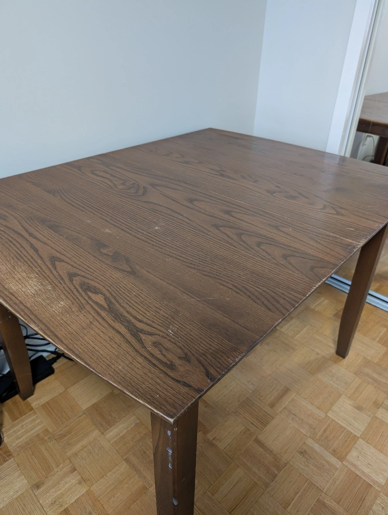 Selling a solid wooden dining table in good condition. It features a beautiful dark wood grain finish with a classic design. The table has a sturdy structure and is perfect for dining, work, or other uses.