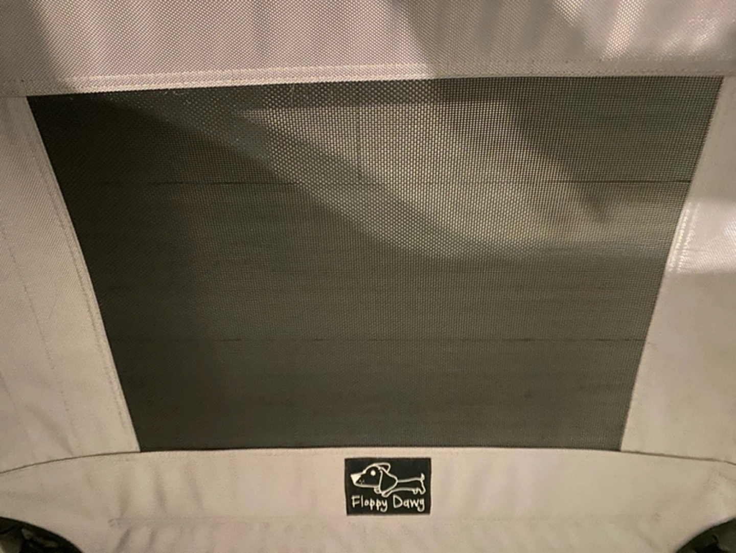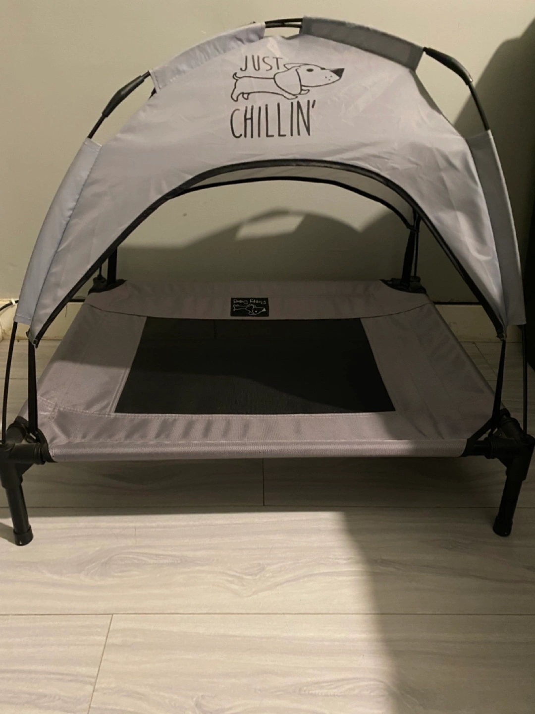 Portable elevated dog bed. Includes a removable sunshade canopy. Grey fabric. Easy to assemble and store. Perfect for indoor or outdoor use.30in x 24in