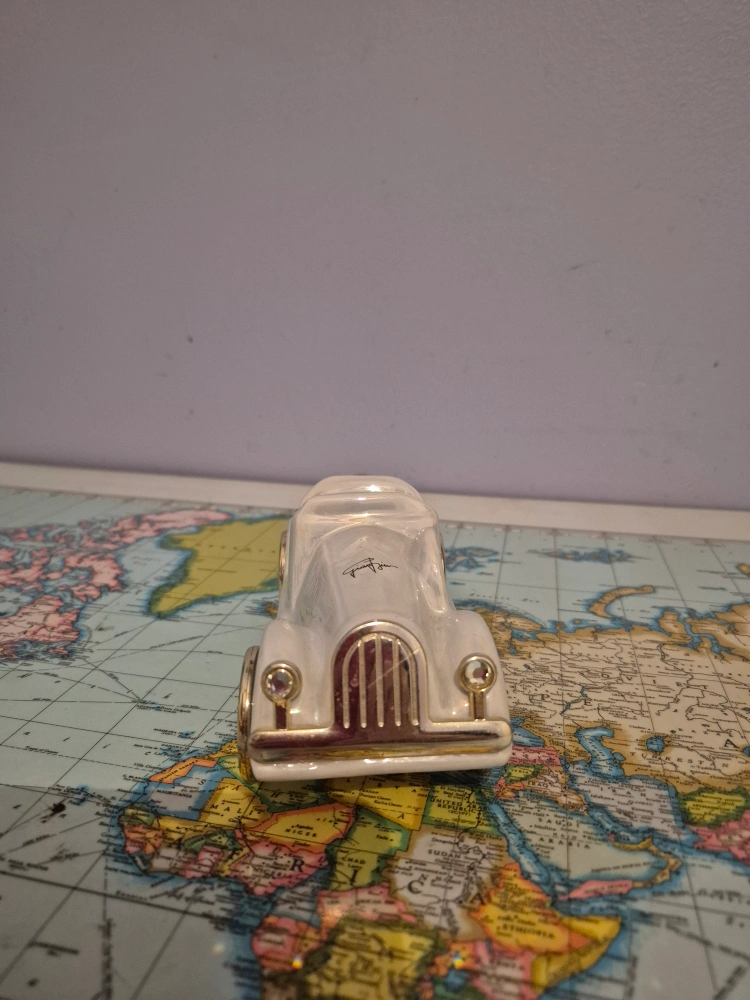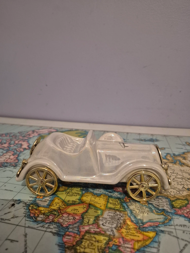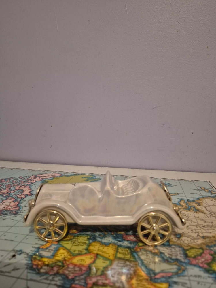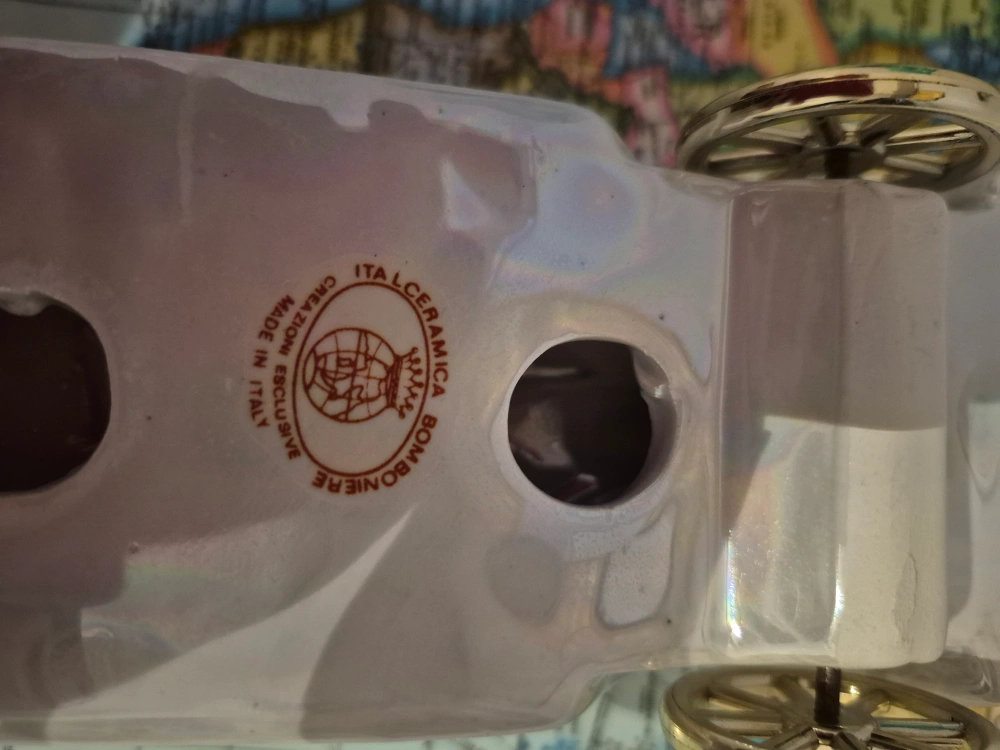 Rare - Ceramic Coupe by Linea Lady Caroline. label shows Italceramica brand logo and states it is a bombonier Creazioni Esclusive made in Italy. Established to be 20th mid- century. size 6 3/4 inches long, 2 3/4 inches wide and 3 inches high. White Ceramic with a mother of pearl luster finish glaze. metallic gold tone, wheels on the Coupe turn, rolls. In Excellent Condition. No chips, brakes or cracks. Beautifull Collector item or as a gift.