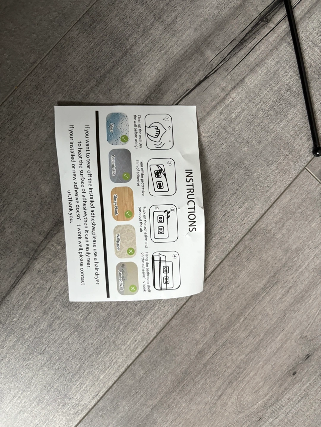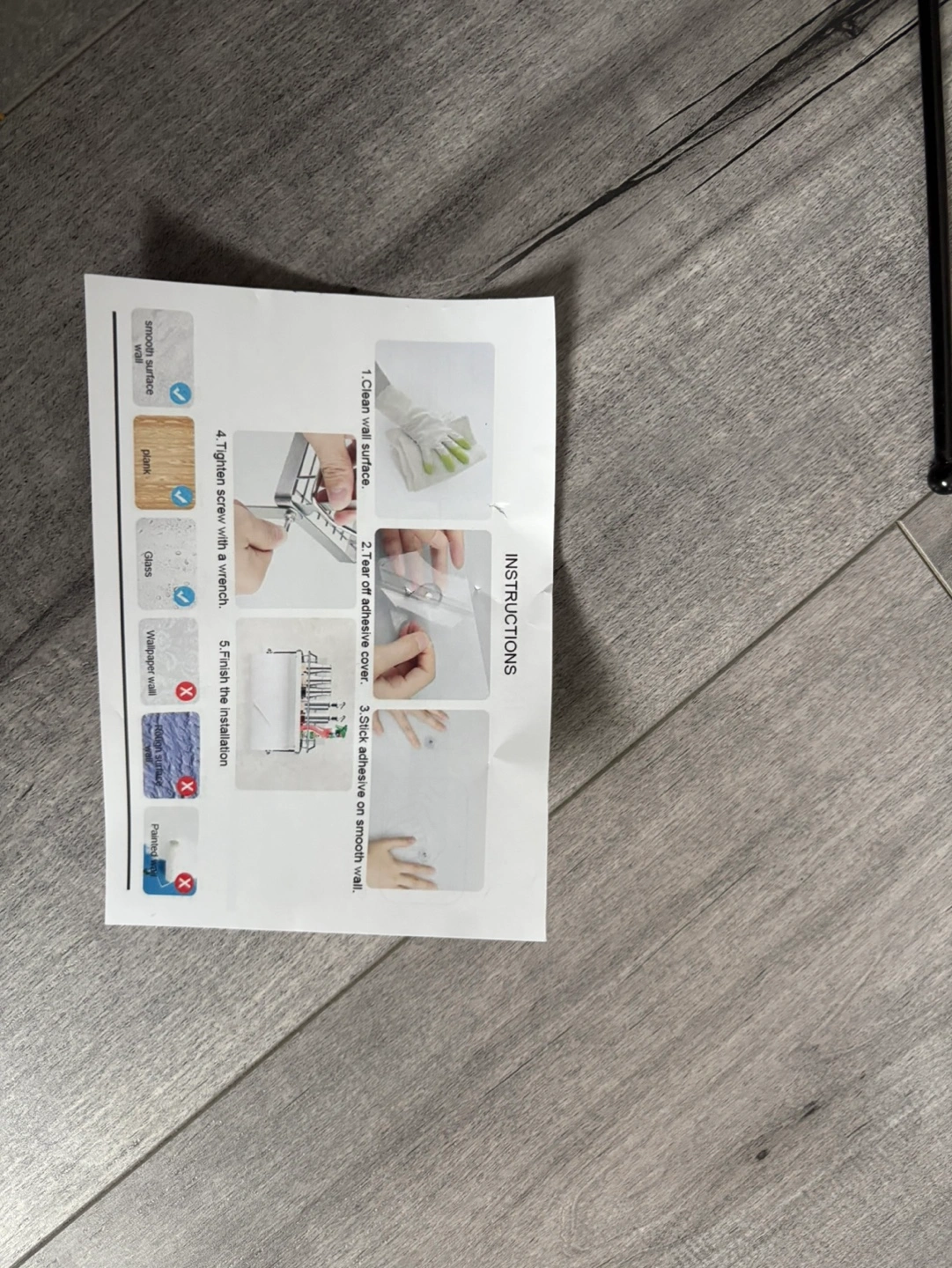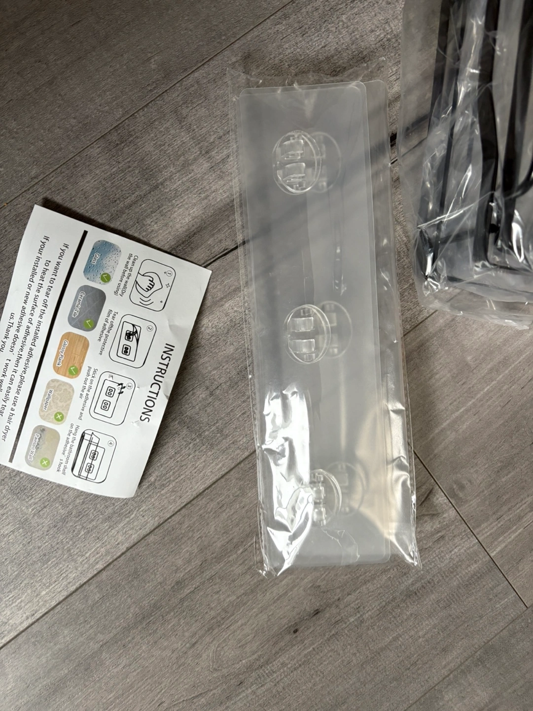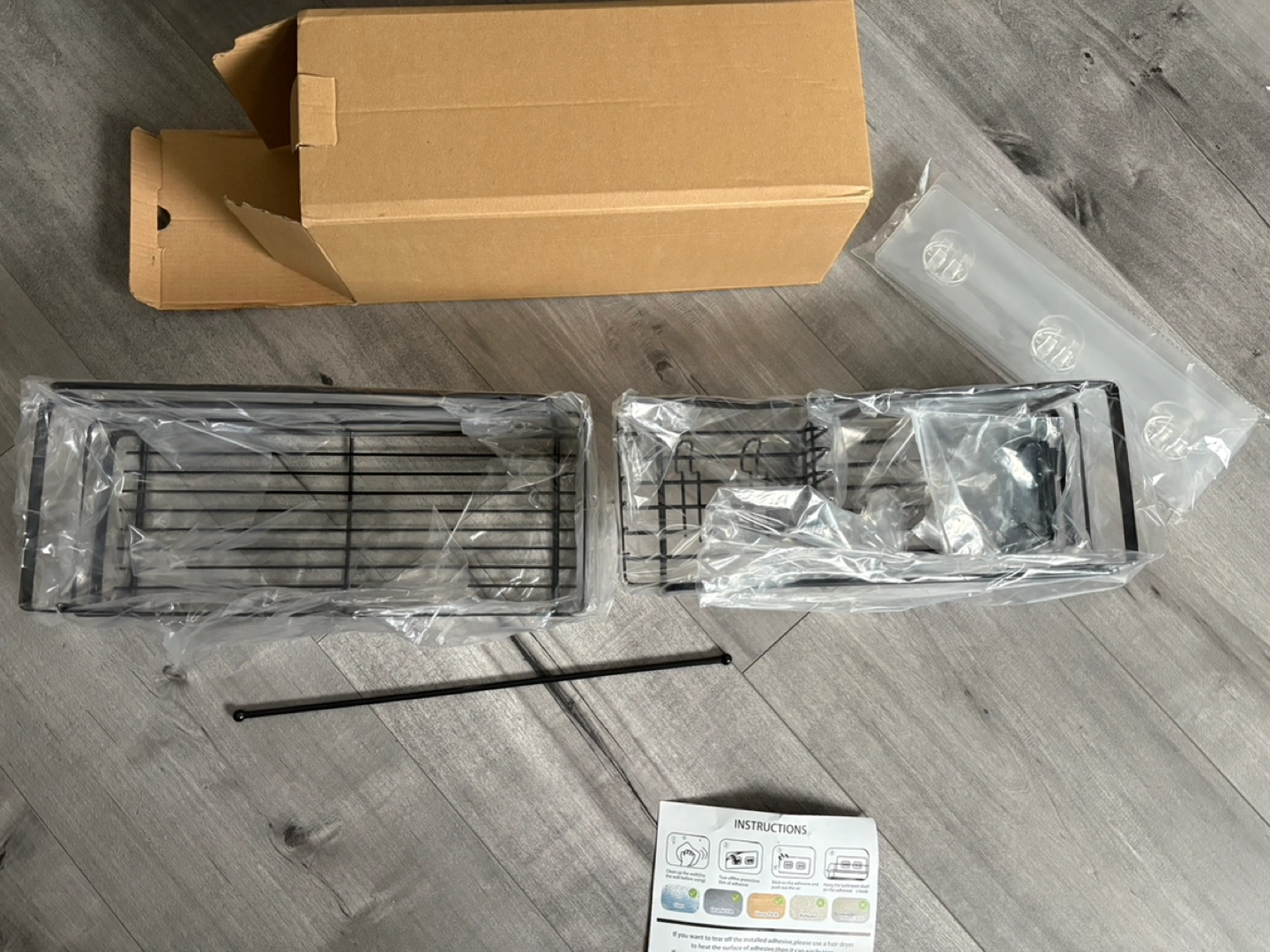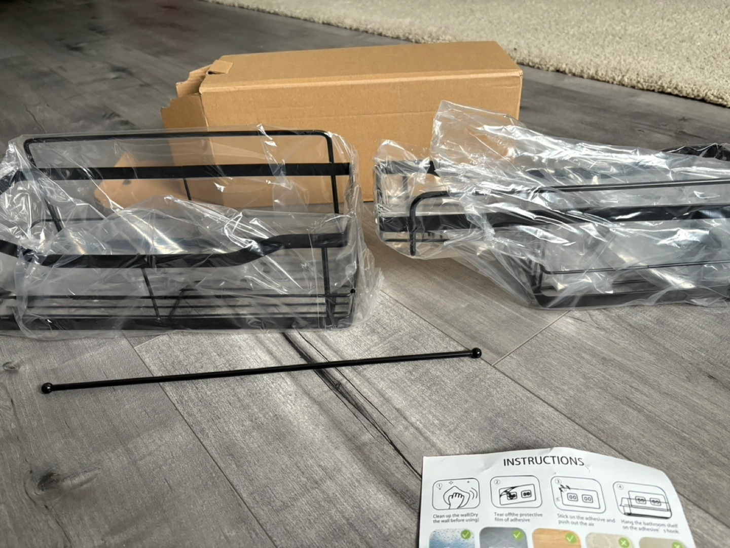 Two-tiered shelf organizer. Black metal frame. Includes adhesive strips and screws for installation. Great for bathroom or kitchen.