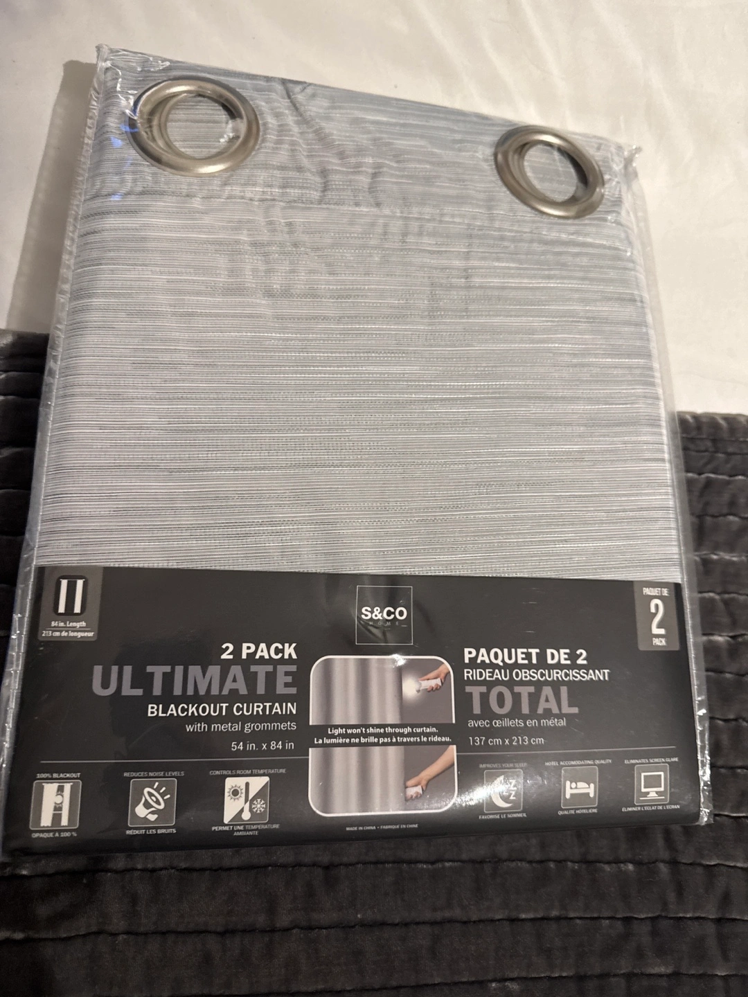 27New in package. Grey blackout curtains. 54" x 84". Metal grommets. Two panels included. Light blocking. Total blackout.