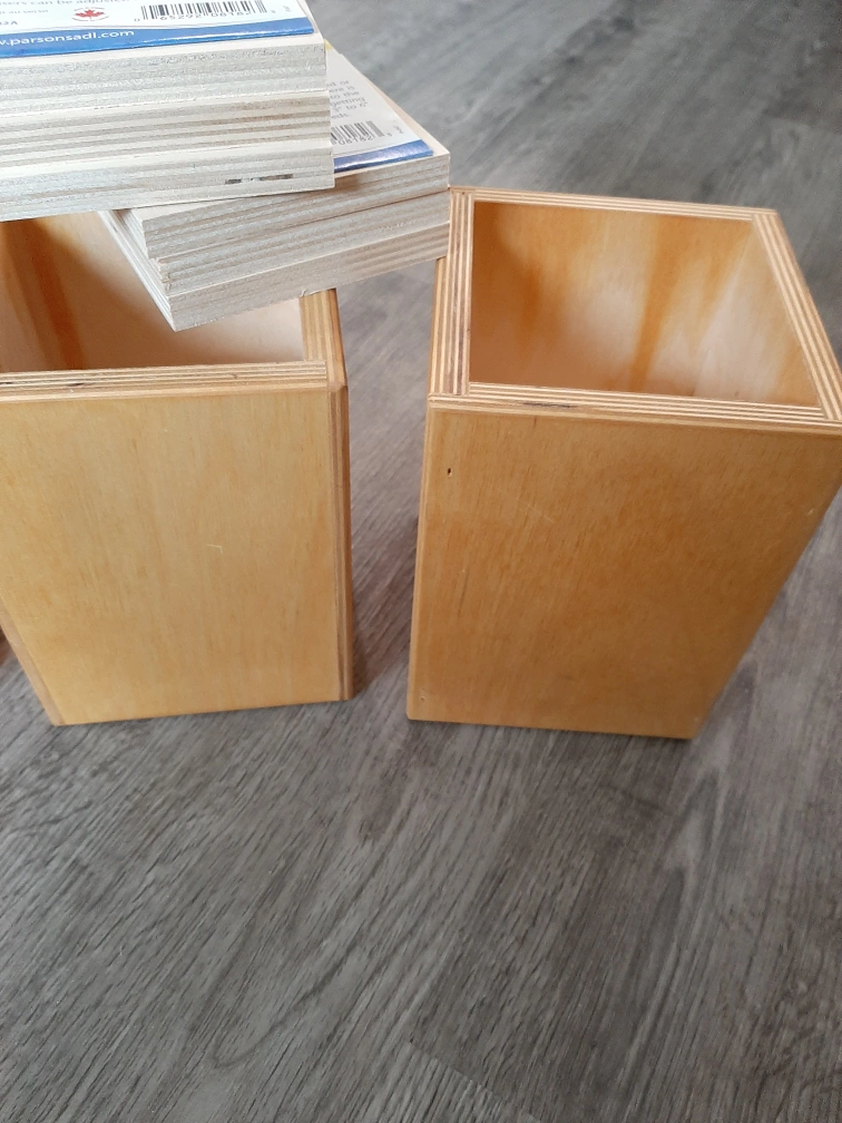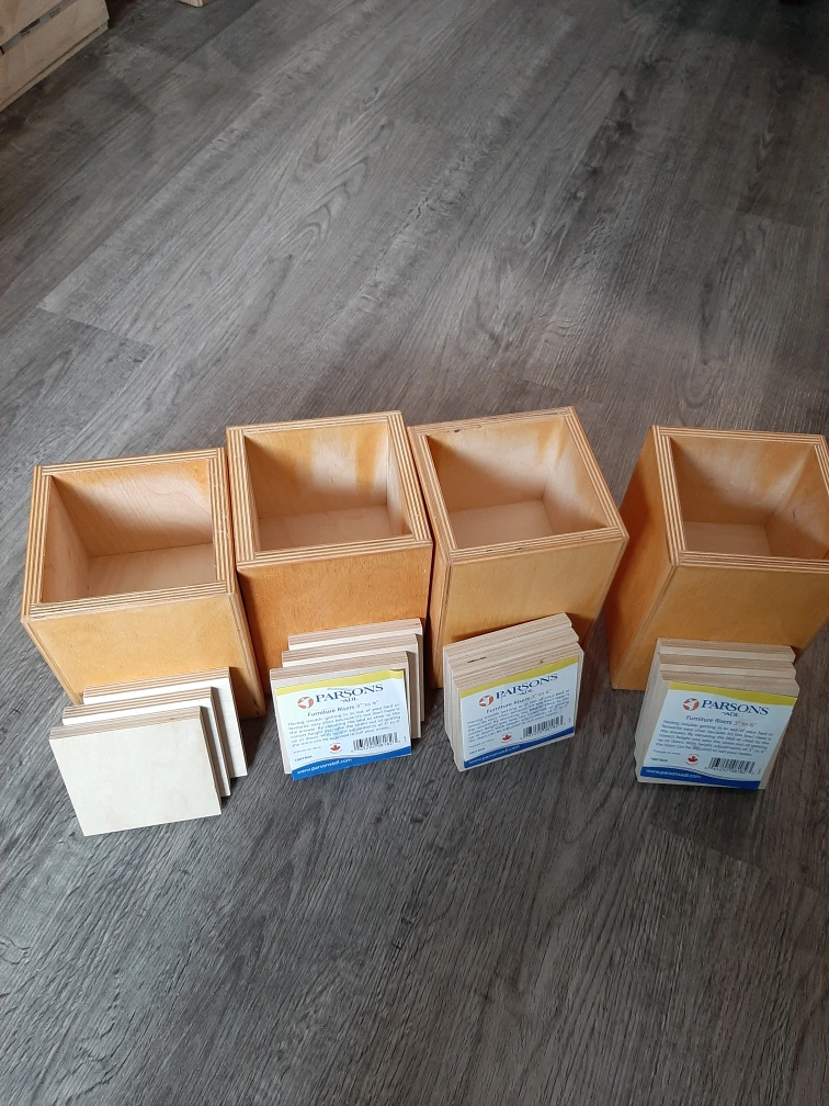 Four wooden furniture risers. Each riser includes multiple thin plywood pieces. Ideal for raising furniture height. Brand new, never used.