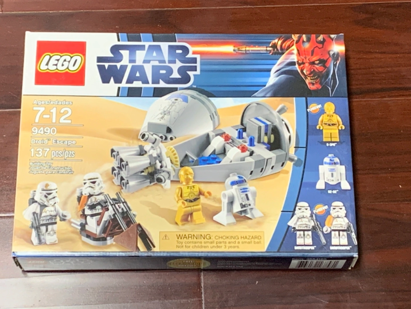 Sealed LEGO Star Wars Droid Escape set. Number 9490. Includes C-3PO, R2-D2, and Sandtroopers. 137 pieces.