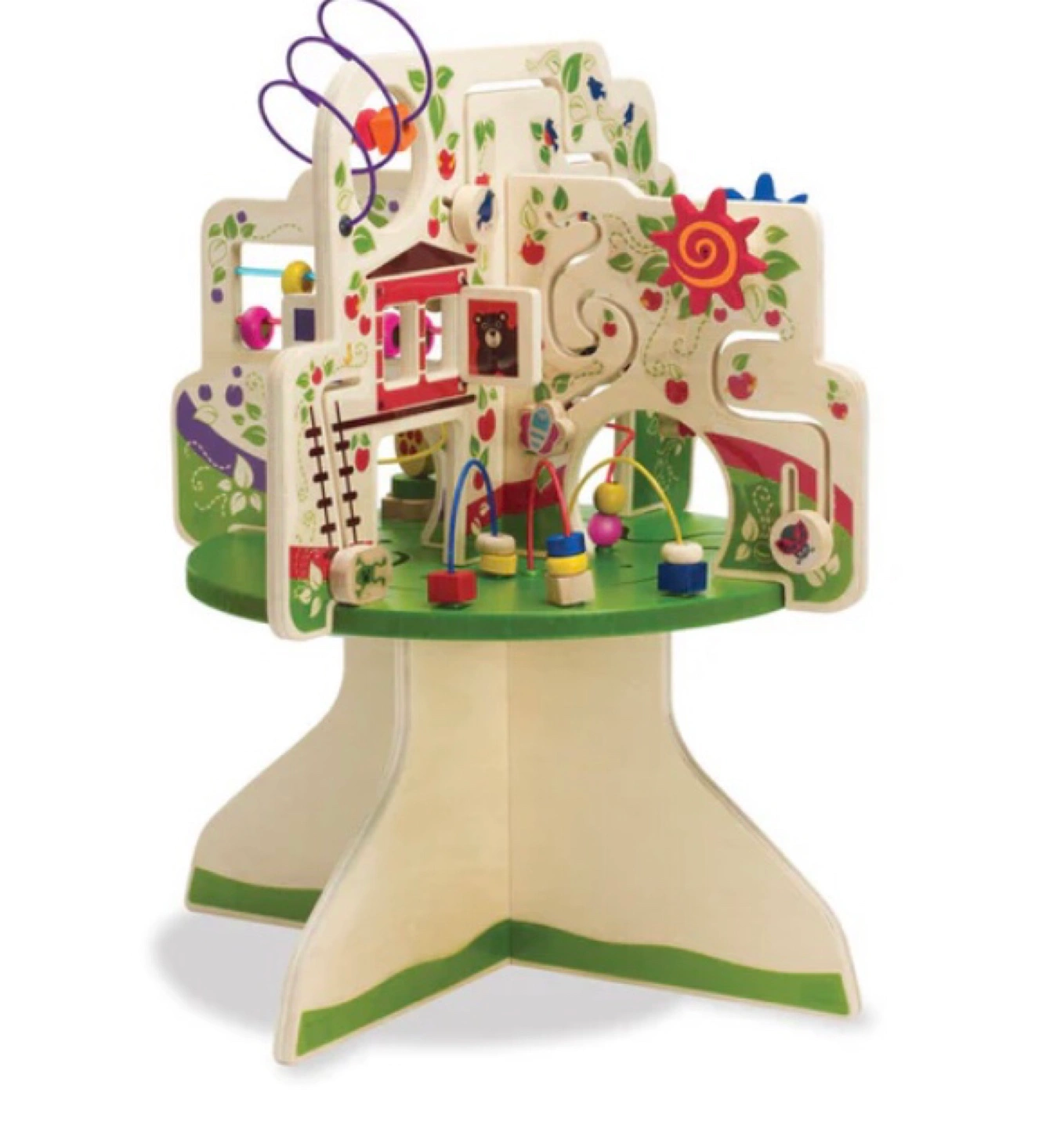 Adorable wooden Tree Top Adventures activity centre. Features 4 quadrants with multiple activities including a bead maze, abacus, and spinning gears, windows, and many more. Will keep your toddler entertained for hours, while helping them to develop their fine motor skills and understand cause and effect.