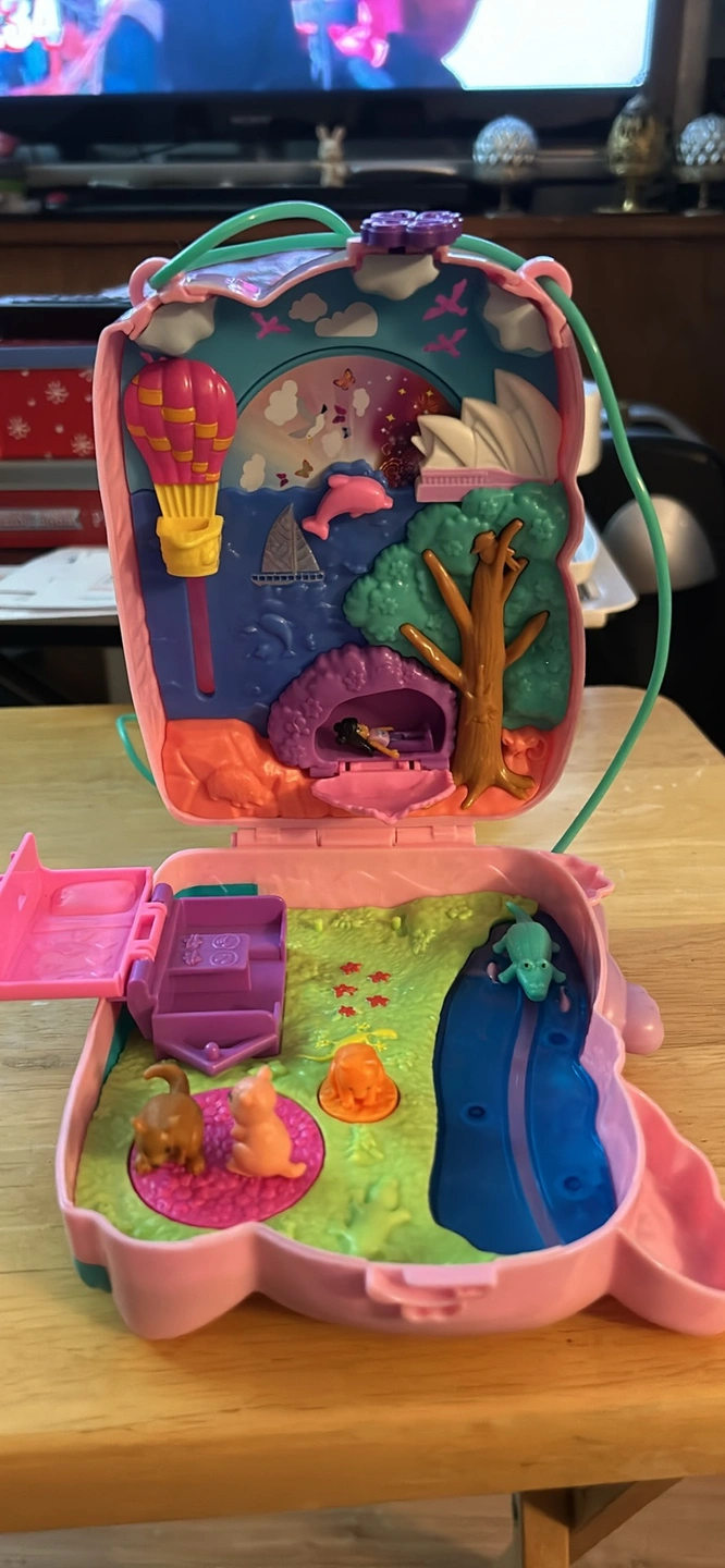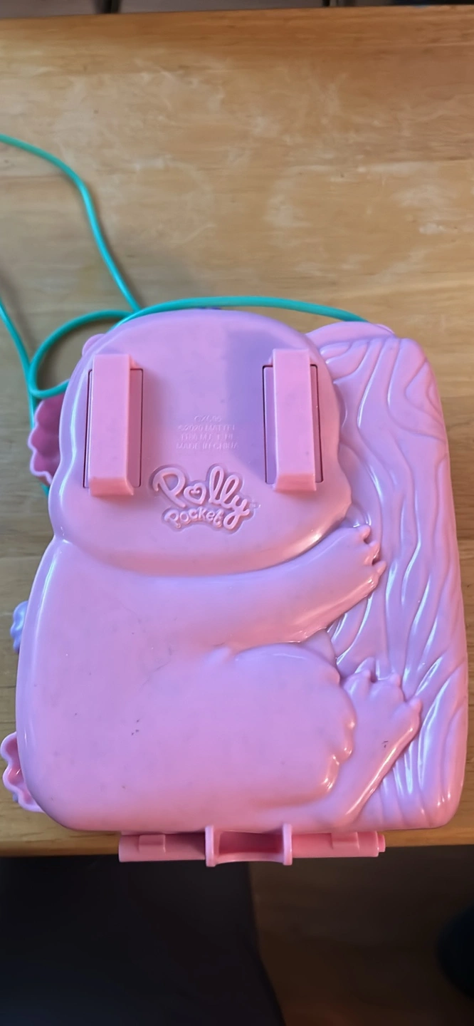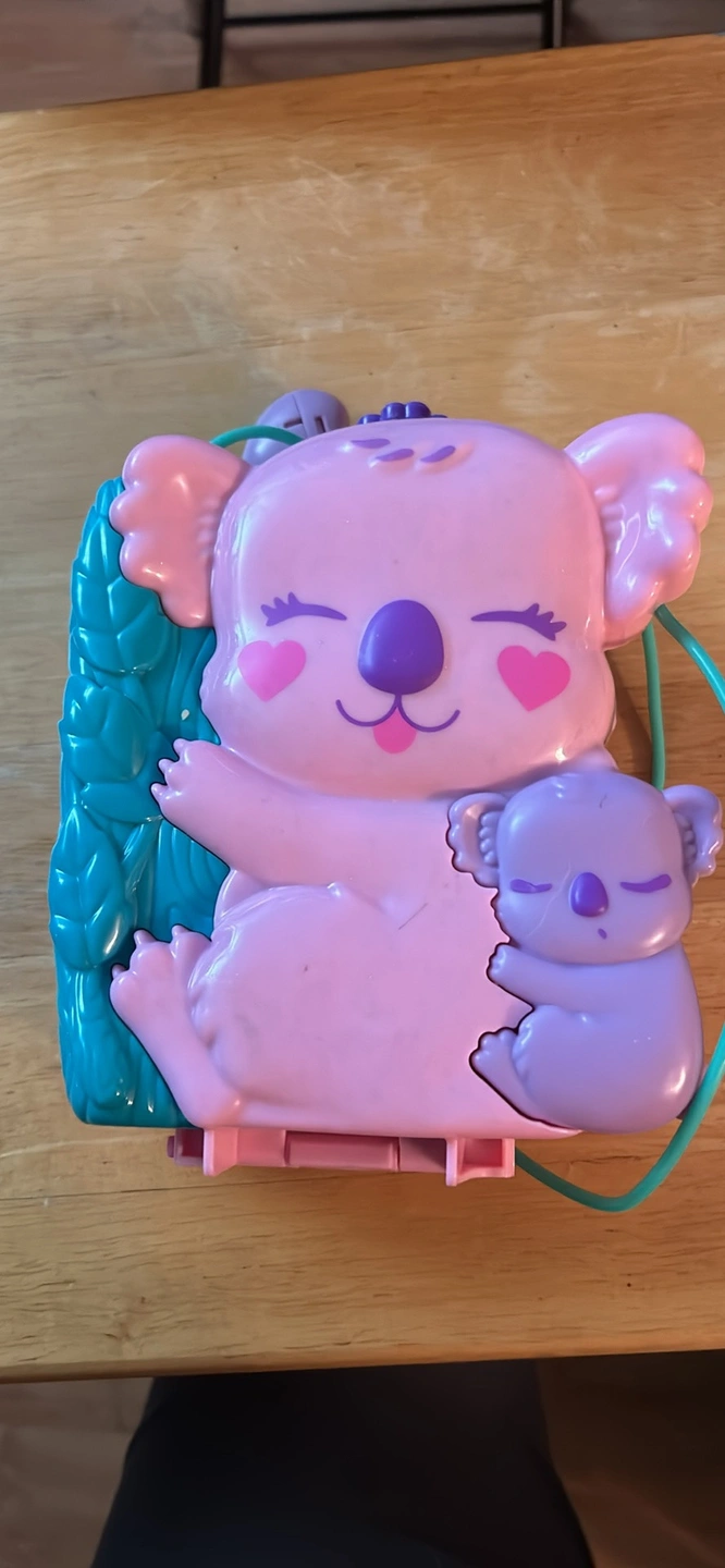 Vintage Polly Pocket koala-shaped compact. Features a teal carrying strap. Includes various miniature accessories. Great for collectors.