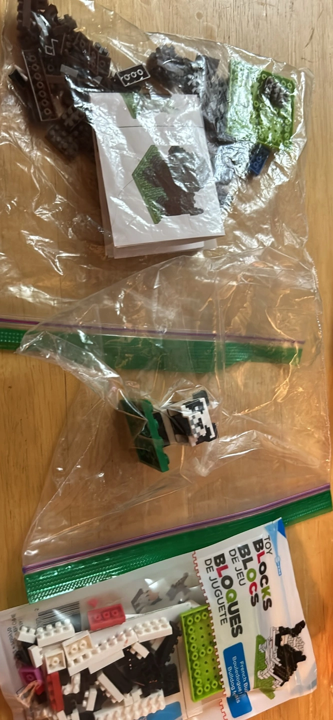 734Two sets of mini building blocks. One features a panda, the other a dog. Includes instructions and extra pieces. Great for kids!