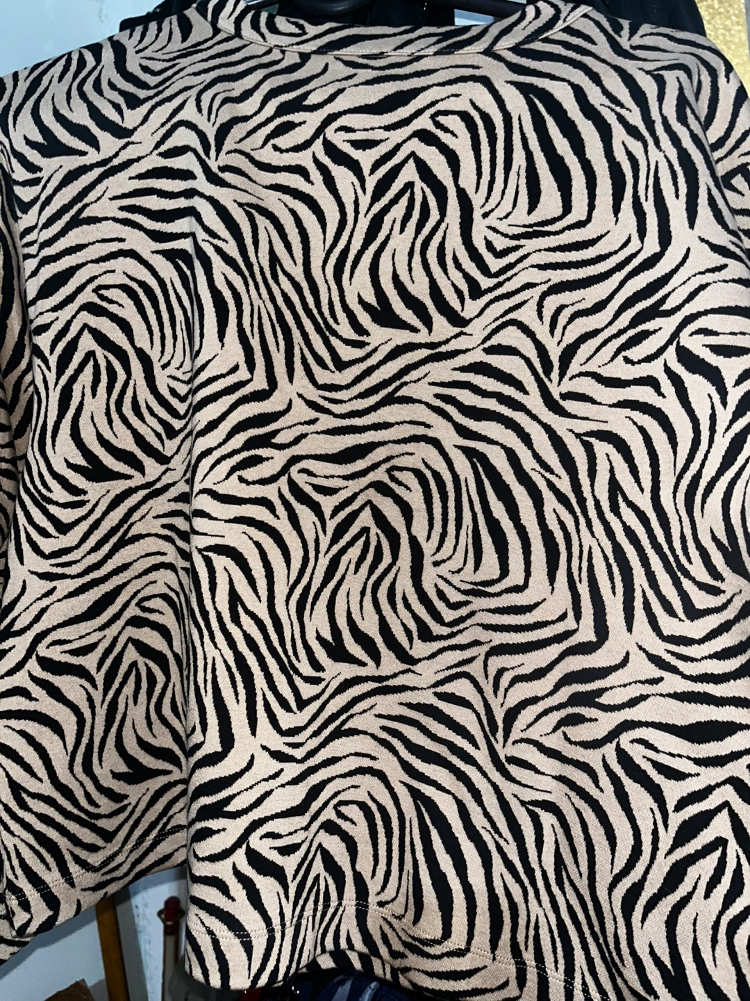 Color is very nice. I like that. It looks like a zebra print. It is a dark beige with lines of black.