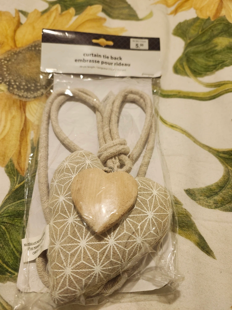 189Beige and brown heart-shaped curtain tie back. Features a smaller wooden heart accent. Made of fabric and rope. New in package.