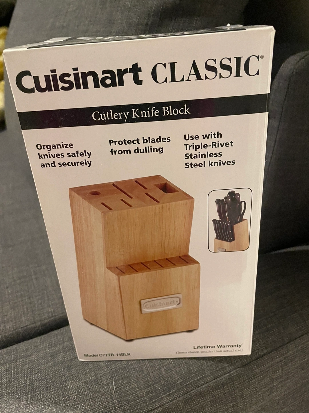 Wooden knife block. Organizes knives safely and securely. Protects blades from dulling. Use with triple-rivet stainless steel knives. Lifetime warranty. Model C77TR-14BLK.